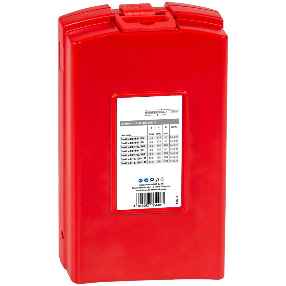Fischer 553210. Uso adecuado: Martillo perforador, Tipo de broca: Juego de brocas, Adecuado para materiales: Ladrillo, Concreto, Piedra natural. Tipo de embalaje: Caja. Número de brocas: 7 pieza(s), Tamaños del juego de brocas: 5, 2 x 6, 2 x 8, 10, 12 ø