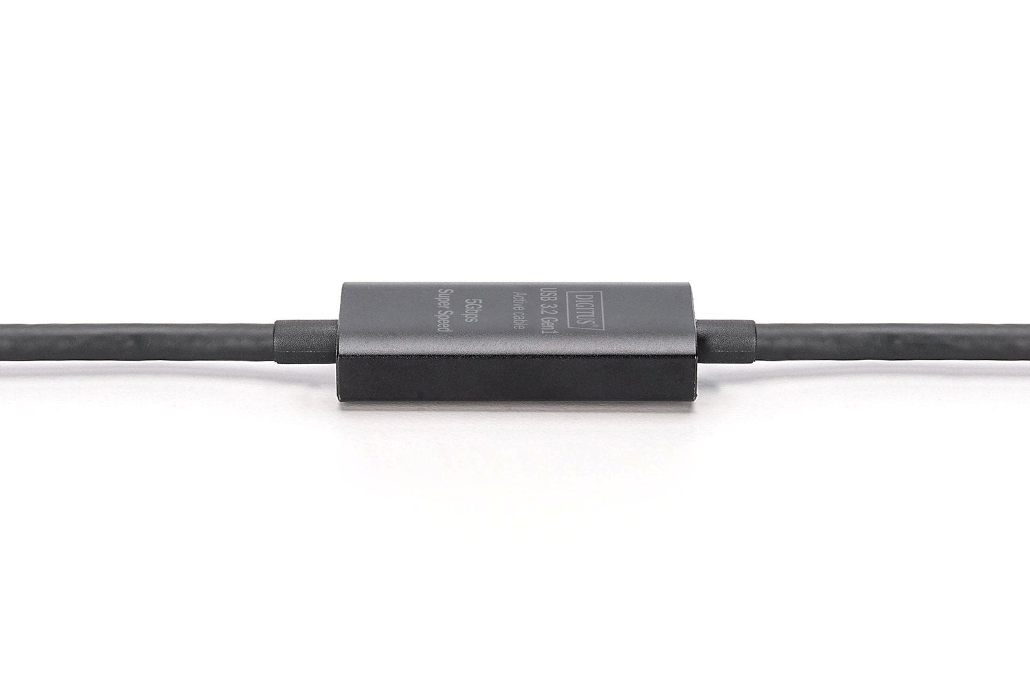 La extensión activa Digitus USB 3.2 Gen1 amplía la longitud del cable de un dispositivo USB 3.2 en 10 metros y garantiza una rápida velocidad de transferencia de datos de 5 Gbit/s en toda la longitud.