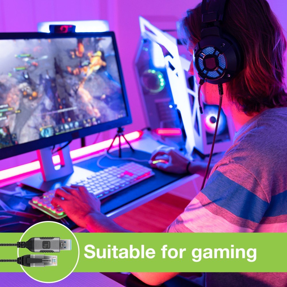 Techly ICOC U3A-RJ45-010. Longitud de cable: 1 m, Cable estándar: Cat6, Blindaje de cable: F/UTP (FTP), Conector 1: USB tipo A, Conector 2: RJ-45, Contactos del conector chapado: Níquel, Velocidad de transferencia de datos: 1000 Mbit/s, Color del producto: Negro, Plata