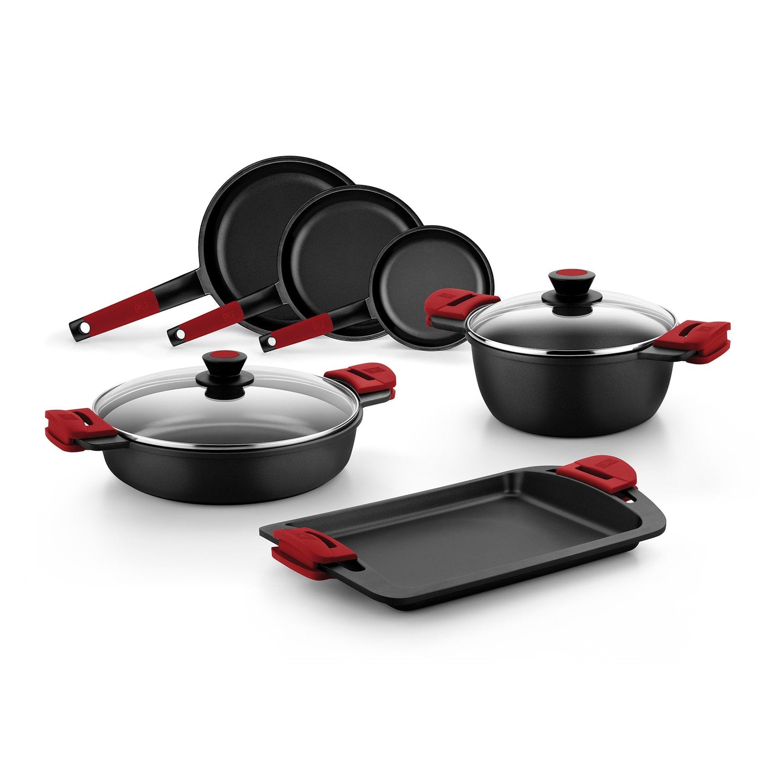 - Incluye tapa de cristal con pomo termo resistente y dos asas de silicona en color rojo.