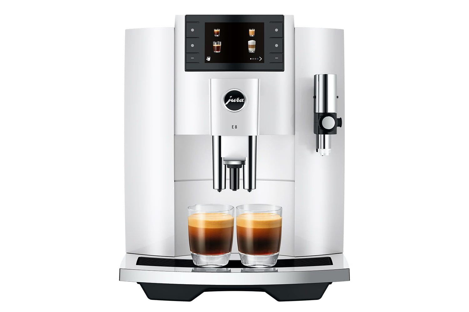 JURA E8 (EC). Tipo de producto: Máquina espresso, Máquina de café: Totalmente automática, Capacidad de reservorio de agua: 1,9 L, Café tipo de entrada: Granos de café, De café molido, Capacidad en tazas: 16 tazas, Molinillo integrado. Potencia: 1450 W. Color del producto: Blanco