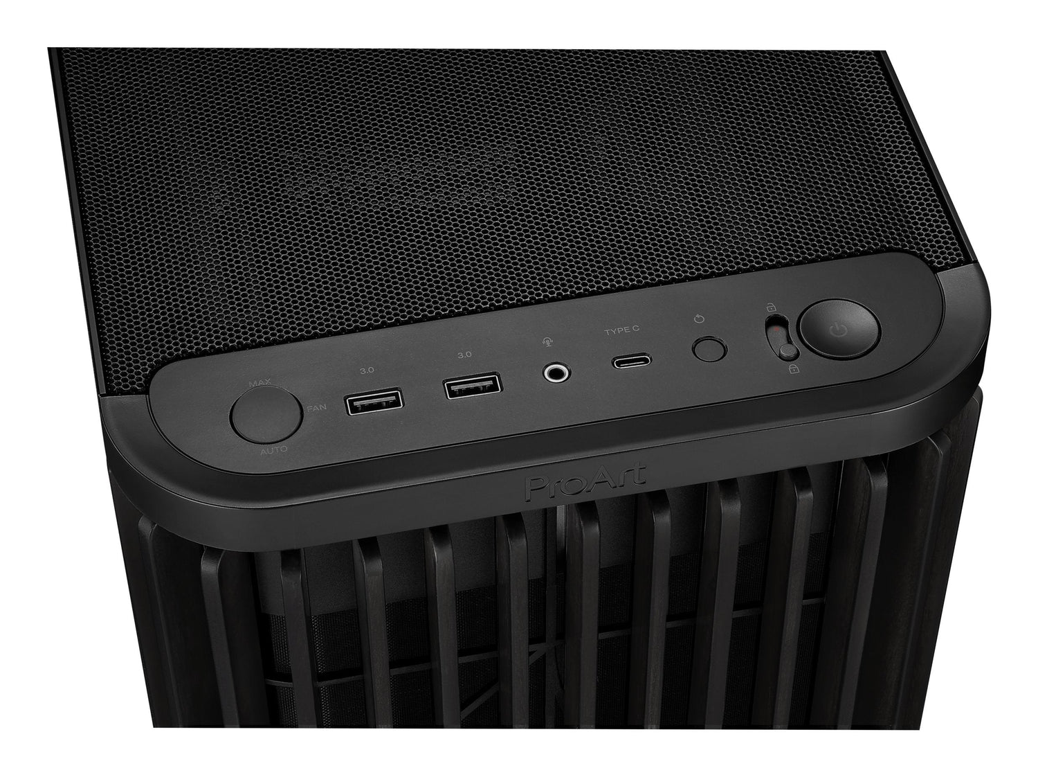 ASUS ProArt PA401 Wood METAL PWM (Black). Factor de forma: Torre, Tipo: PC, Color del producto: Negro. Ventiladores frontales instalados: 2x 160 mm, Diámetro de ventiladores frontales soportados: 140,160 mm, Diámetro de ventiladores traseros soportados: 120 mm. Tamaños de disco duro soportados: 2.5,3.5". Ancho: 225 mm, Profundidad: 412 mm, Altura: 503 mm. Ancho del paquete: 495 mm, Profundidad del paquete: 295 mm, Altura del paquete: 570 mm