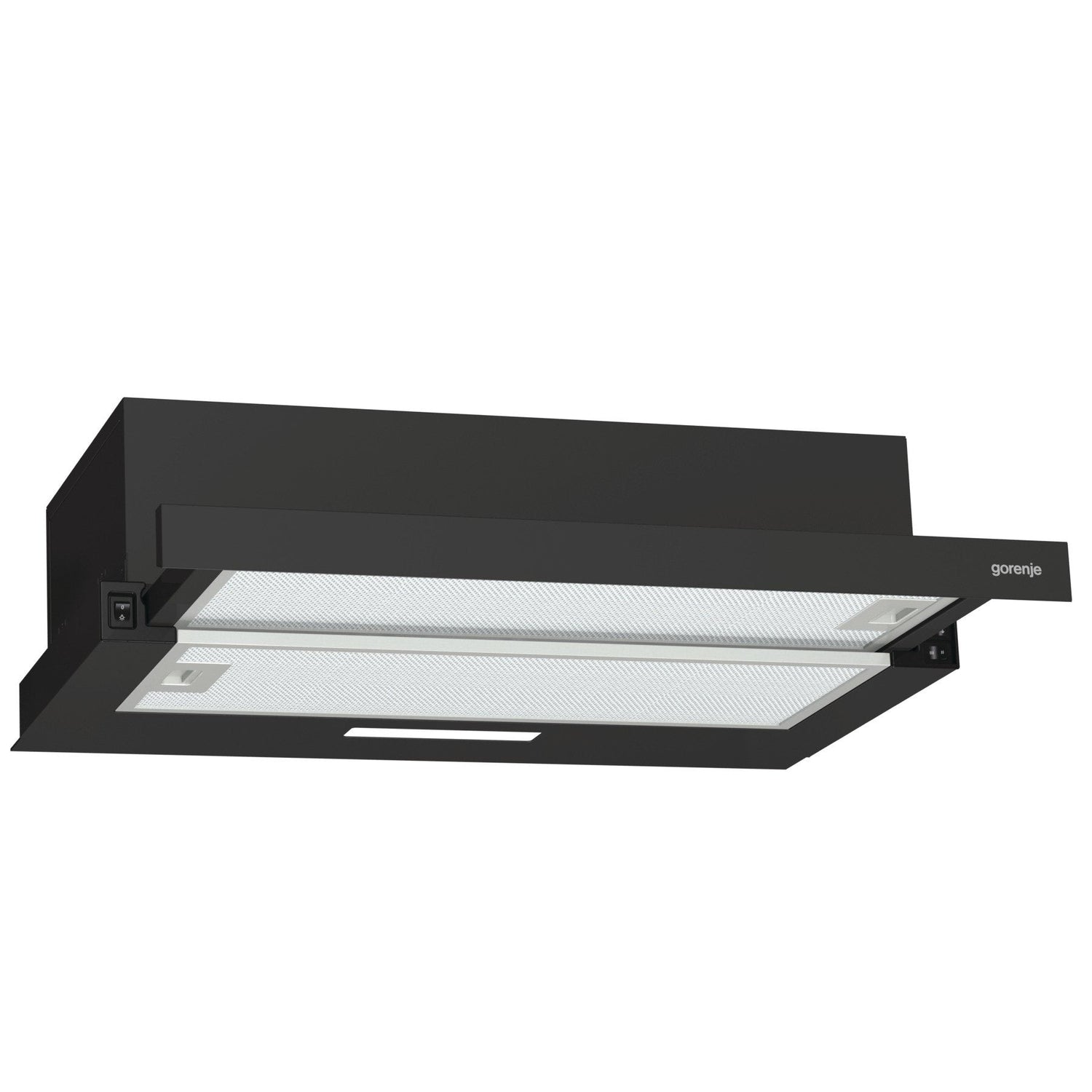 Gorenje TH60E3B. Máxima capacidad de extracción: 350 m³/h, Tipo de extracción: Canalizado/Recirculación, Clasificación eficiencia dinámica de fluidos: E. Tipo: Semintegrada (extraíble), Color del producto: Negro, Material de la carcasa: Metal. Tipo de filtro de grasa: Aluminio. Número de bombillas: 1 bombilla(s). Consumo de energía anual: 48,4 kWh, Carga conectada: 110 W, Potencia del motor: 110 W