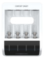 Ansmann Comfort Smart. Adecuado para: Pilas de uso doméstico, Alimentación: USB, Tecnología de baterías compatibles: Níquel-metal hidruro (NiMH). Color del producto: Negro, Blanco. Voltaje de entrada: 5 V, Voltaje de salida USB: 5 V. Cantidad por paquete: 1 pieza(s). Tipo de embalaje: Envase para colgar
