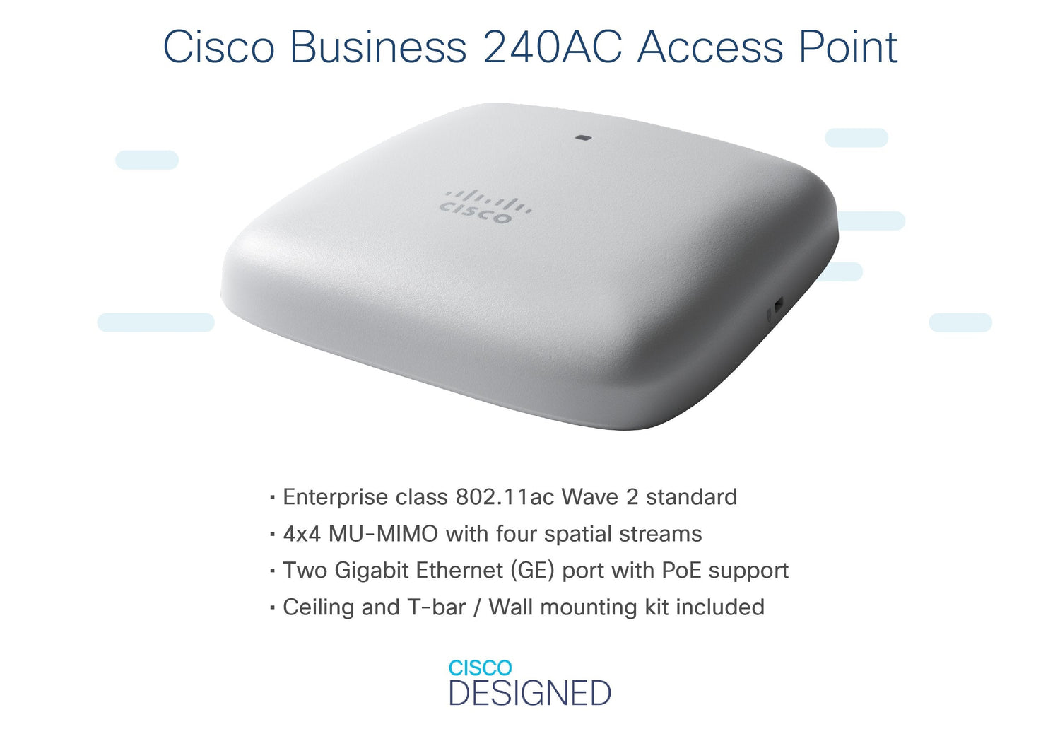 Cisco CBW240AC, 2,4 GHz, 5 GHz, 1733 Mbit/s, WPA, WPA2, WPA3, WPA2-Enterprise, 10,100,1000 Mbit/s