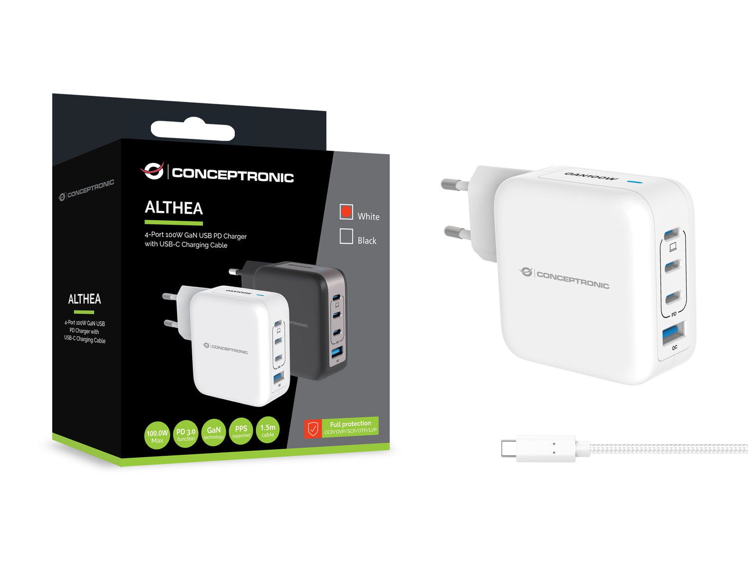 Conceptronic ALTHEA18W. Tipo de cargador: Interior, Alimentación: Corriente alterna, Compatibilidad del cargador: Universal. Voltaje de entrada: 100 - 240 V, Voltaje de salida máximo: 20 V. Número de puertos USB Tipo C: 3, Carga rápida, Funciones de protección de poder: Sobrecalentamiento, Sobrecarga, Cortocircuito. Longitud de cable: 1,5 m, Color del producto: Blanco