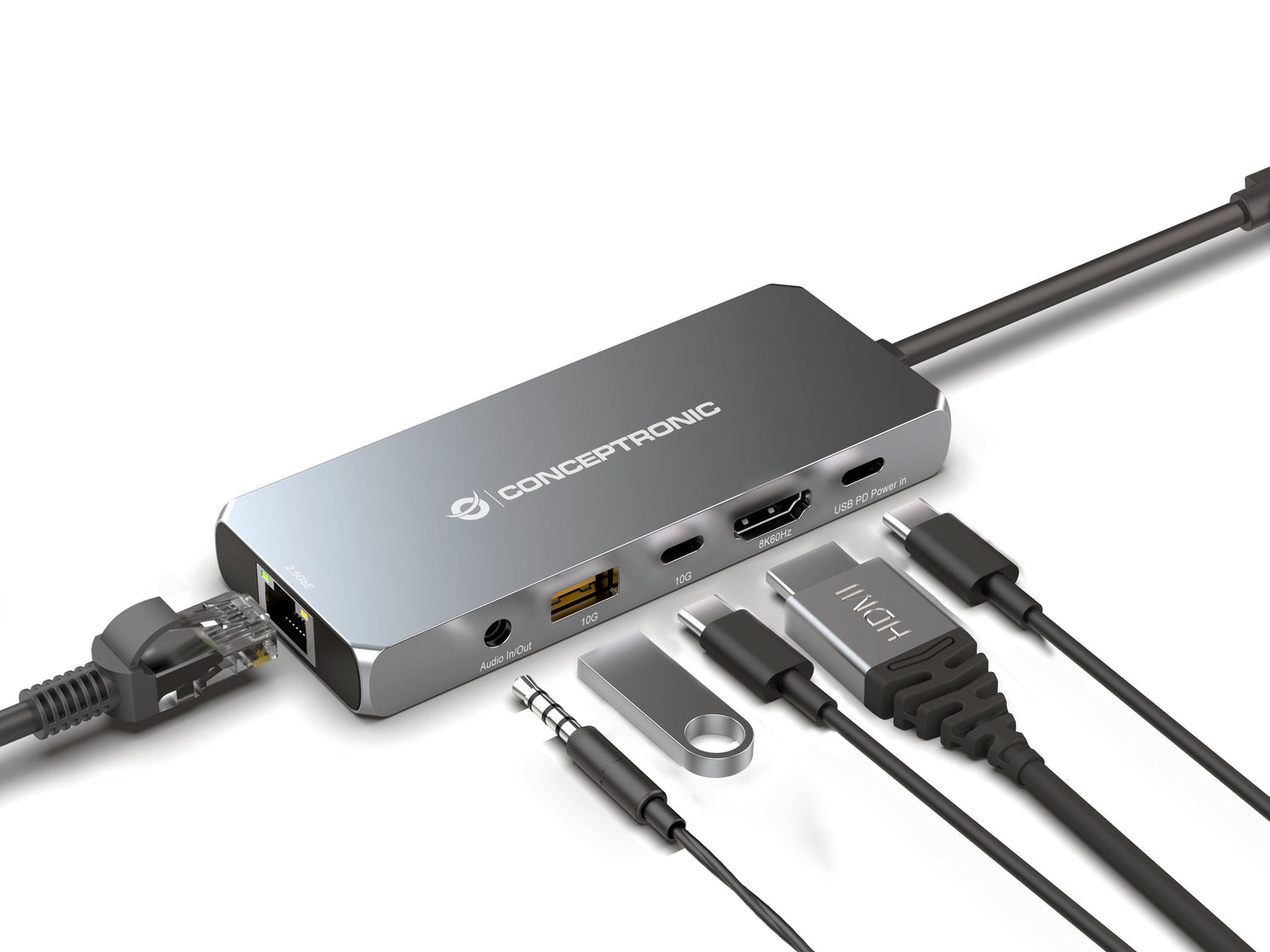 Conceptronic DONN22G, Alámbrico, USB 3.2 Gen 2 (3.1 Gen 2) Type-C, 100 W, 3,5 mm, 2500 Mbit/s, Gris