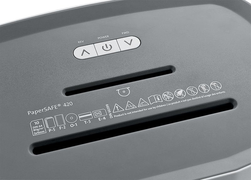Dahle PS 420. Tipo de triturador de papel: Corte cruzado, Tamaño de trituración de papel: 2 x 15 mm, Capacidad de la cesta: 25 L. Consumo energético: 350 W, Voltaje de entrada AC: 230 V, Frecuencia de entrada AC: 50 Hz. Ancho: 443 mm, Profundidad: 273 mm, Altura: 545 mm