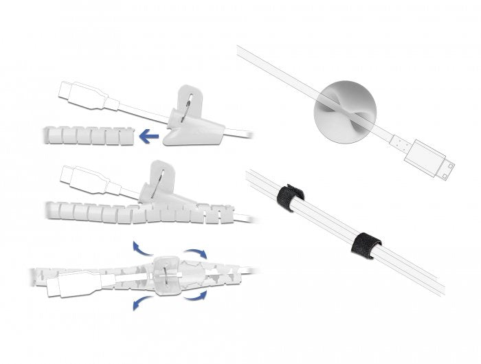 Este juego de manejo de cables de Delock es perfecto para mantener los cables expuestos ordenados, protegidos y limpios, p. ej., en la oficina o en casa. Incluye tres portacables, una manguera en espiral y una cinta de gancho y bucle.