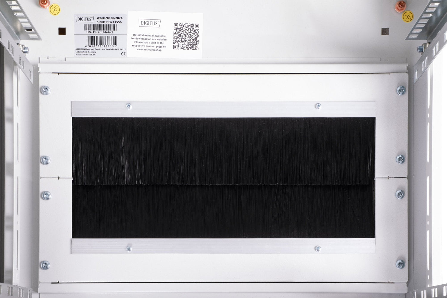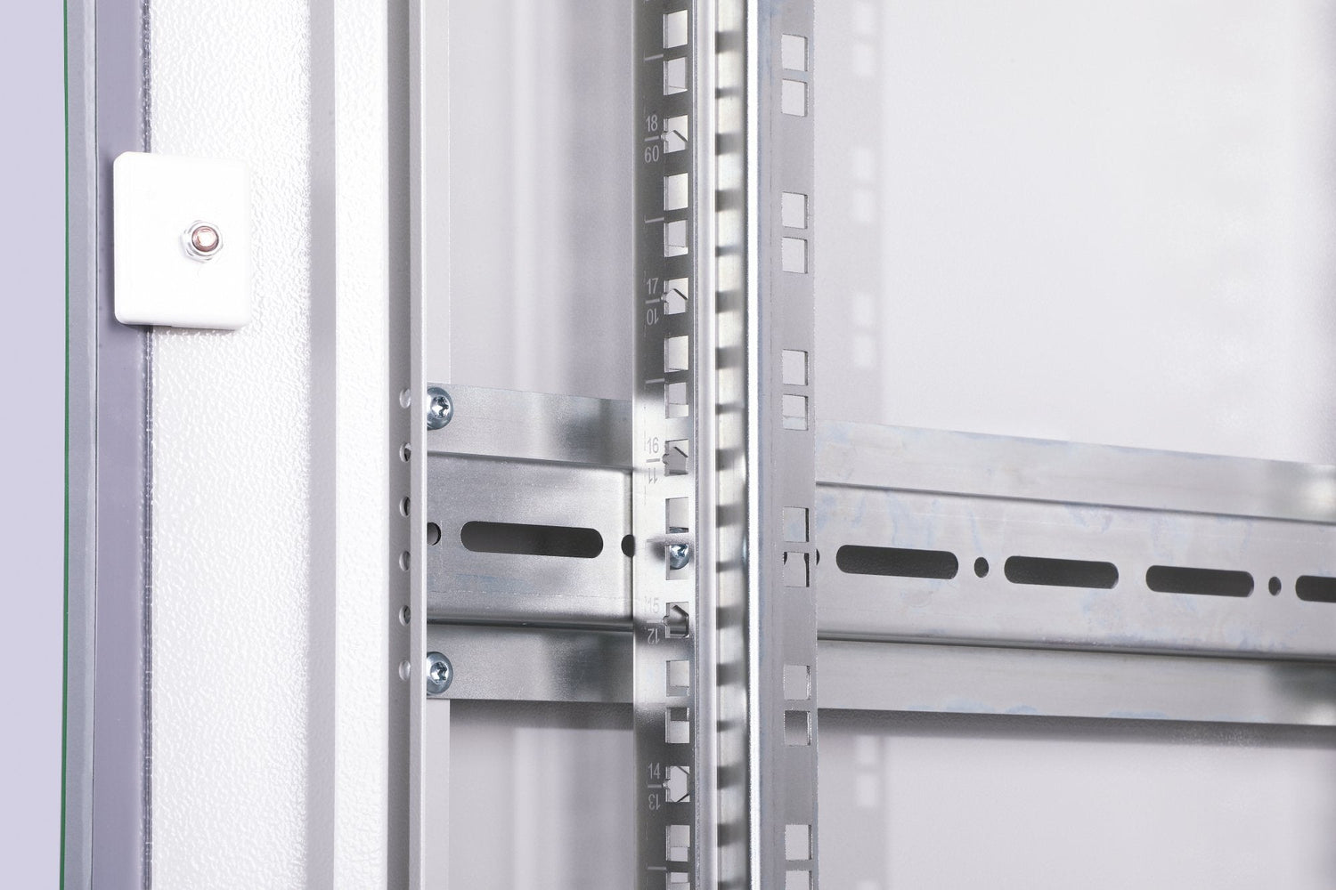 Los armarios de red de la serie Unique se han diseñado y fabricado para un cableado de red especialmente cómodo y flexible. Las sofisticadas optimizaciones ofrecen una estabilidad acorde con el mercado con la máxima flexibilidad. Un chasis base modular, que puede abrirse mediante paneles ciegos atornillados de 483 mm (19"), ofrece espacio suficiente para cables de todo tipo. También hay entradas de cables con cepillos en la parte trasera del chasis base. Las bandas de escobillas traseras situadas encima y debajo de la puerta trasera (a partir de 26U) permiten su uso en una amplia gama de escenarios de aplicación. Los amplios conductos de cables verticales con ayudas para el guiado de cables y tapa, instalados en la parte delantera (a partir de 800 mm de ancho de armario), completan a la perfección las versátiles características del armario de red. En el interior hay instalados dos pares de carriles de perfil de 483 mm (19") galvanizados y con manivela, etiquetados con unidades de altura que pueden leerse en direcciones opuestas. Se pueden ajustar de forma continua y están conectados a puntales de profundidad adicionales en el armario. Cada armario es una robusta construcción de chapa de acero de hasta 1,5 mm de grosor. La coloración se realiza mediante recubrimiento electrostático en polvo en los colores estándar gris (RAL 7035) y negro (RAL 9005). Los paneles laterales y las puertas modulares con cerradura y extraíbles mejoran la accesibilidad. Las bisagras de las puertas pueden cambiarse. Además, los armarios pueden desmontarse completamente en caso necesario gracias a su diseño desmontable.