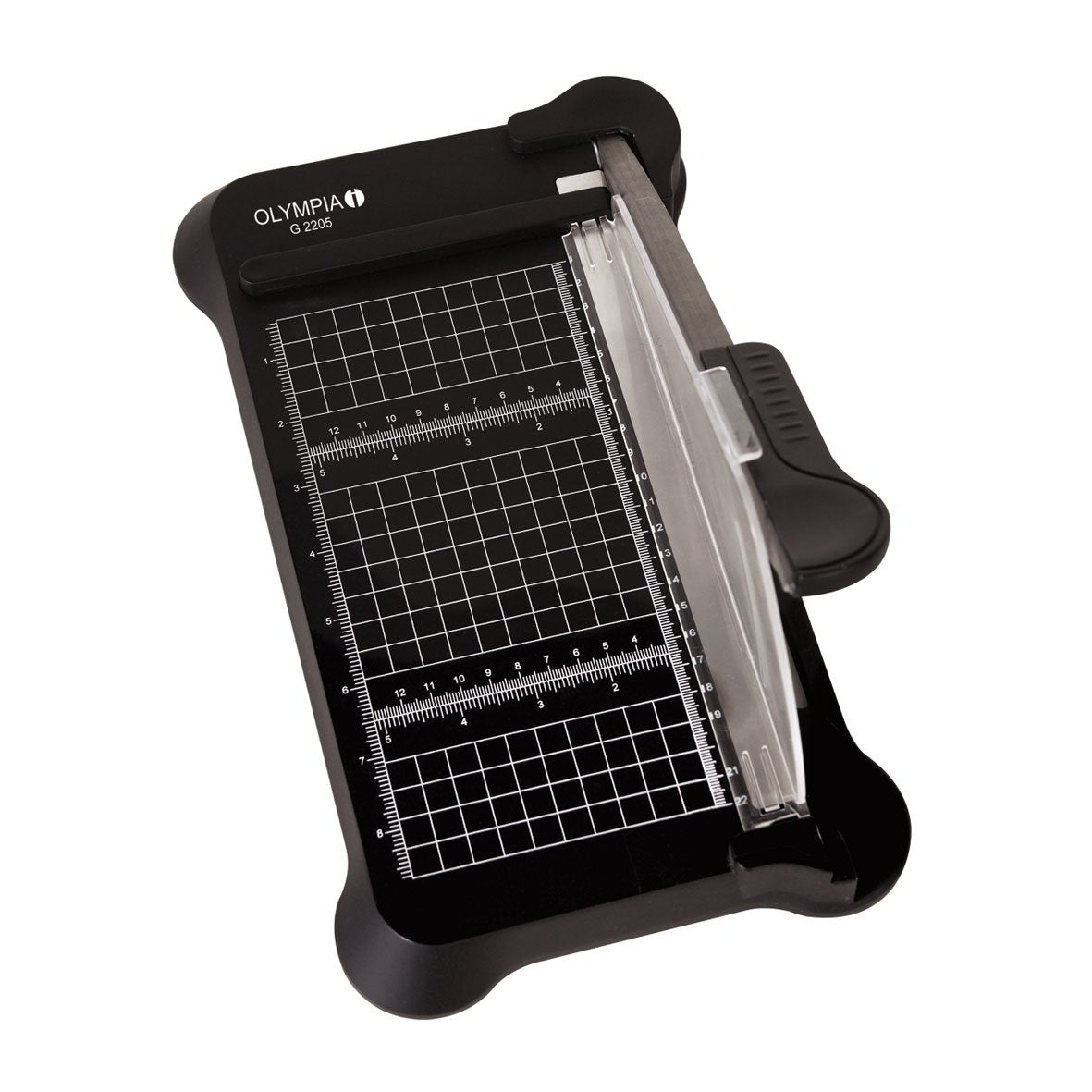 Olympia G 2205. Capacidad de corte: 1 hojas, Longitud de corte: 22 cm, Formato: A5. Peso: 520 g. Dimensiones (Ancho x Profundidad x Altura): 323 x 194 x 164 mm