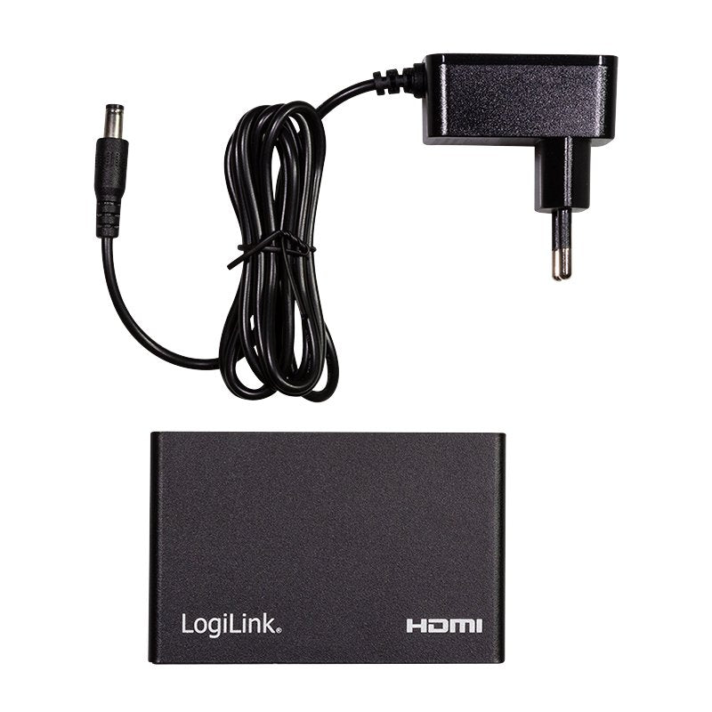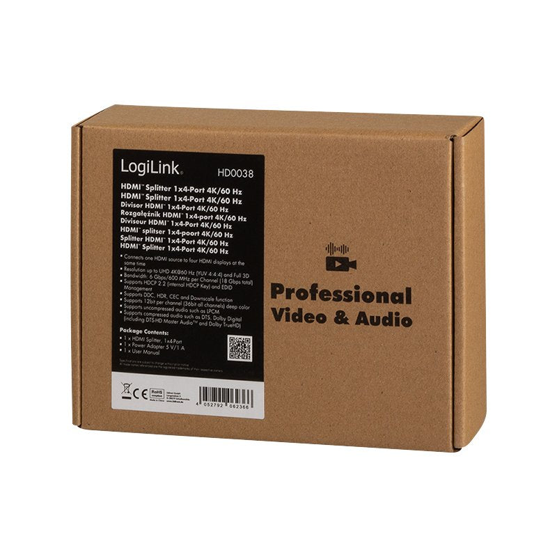 LogiLink HD0038. Tipo de puerto de vídeo: HDMI, Salida de vídeo: 4x HDMI. Color del producto: Negro, Material de la carcasa: Metal, Máxima velocidad de actualización: 60 Hz. Voltaje de entrada AC: 100 - 240 V, Frecuencia de entrada AC: 50 - 60 Hz, Corriente de entrada: 0.2 A. Ancho: 95 mm, Profundidad: 65 mm, Altura: 23 mm. Ancho del paquete: 190 mm, Profundidad del paquete: 145 mm, Altura del paquete: 60 mm