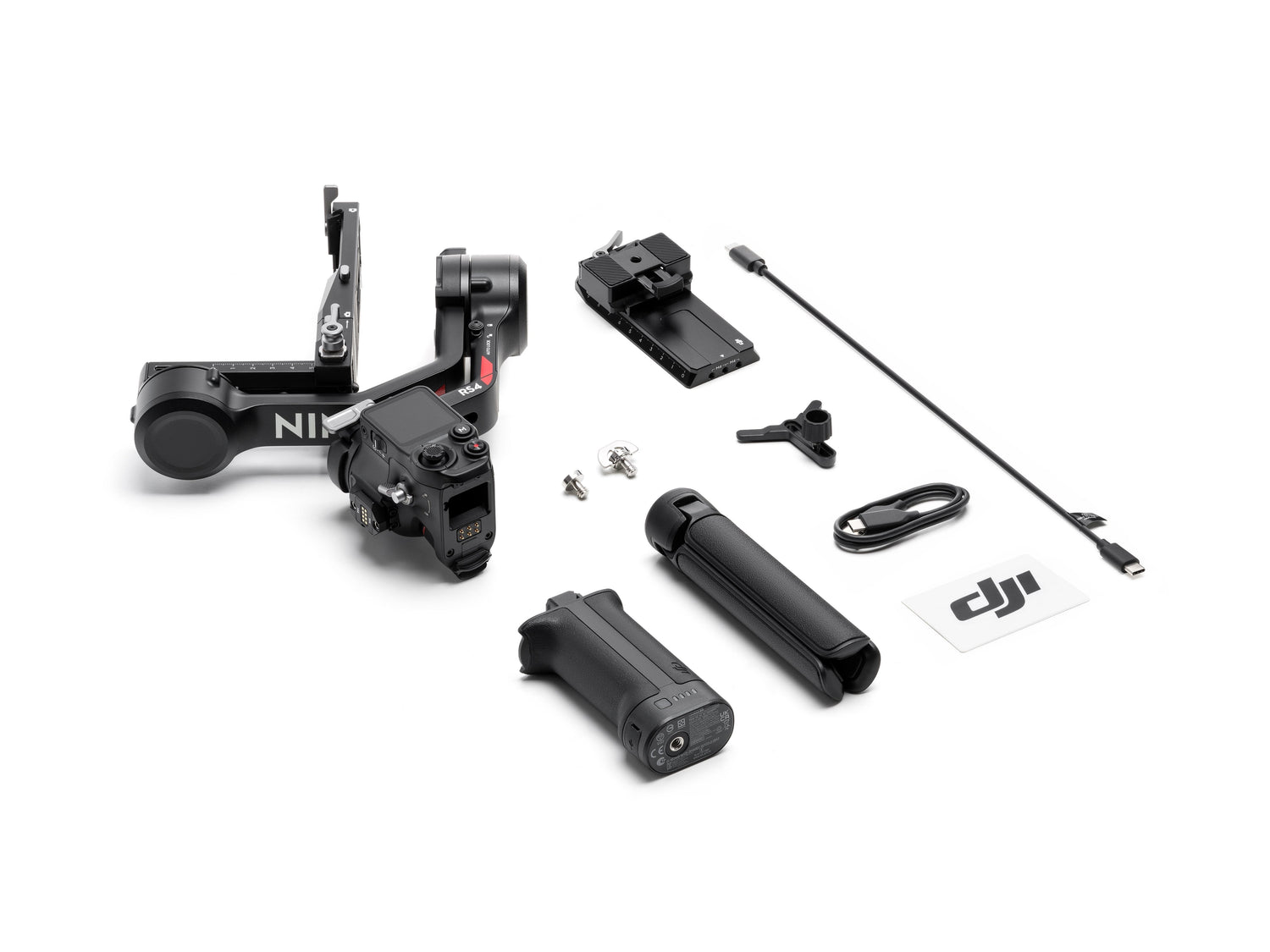 DJI RS4. Tipo: Estabilizador manual para cámara, Material: Aluminio, Color del producto: Negro. Rango controlable de giro: 0 - 360°, Rango controlable de inclinación: -112 - 214°, Rango controlable de alabeo: -95 - 240°. Tecnología de batería: Polímero de litio, Capacidad de batería: 3000 mAh, Tiempo de funcionamiento: 12 h. Peso: 1,07 kg, Ancho: 191 mm, Profundidad: 370 mm