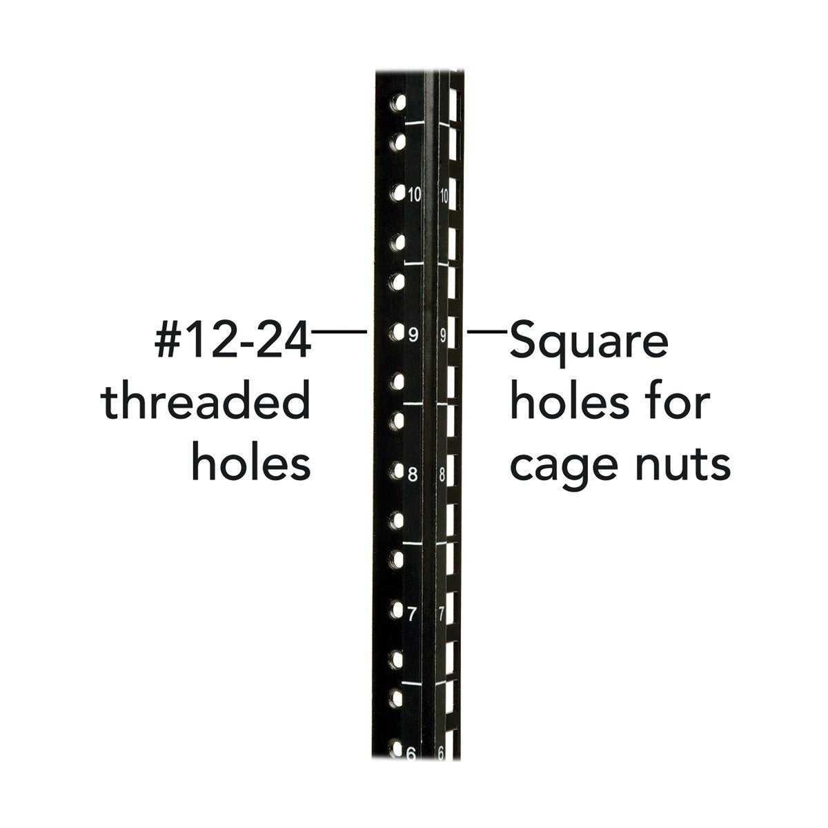 El SRW10USG viene totalmente ensamblado y listo para su instalación en la pared, o utilice el kit de ruedas SRCASTER de Tripp Lite para convertirlo en un rack móvil. Los orificios de instalación cuadrados y roscados y los espacios de rack numerados hacen que la instalación del equipo sea sencilla. Los rieles de instalación verticales se ajustan en incrementos de 2.2 mm (7/8") para alojar el equipo a una profundidad de hasta 52 cm (20.5"), como conmutadores de red y paneles de conexión.