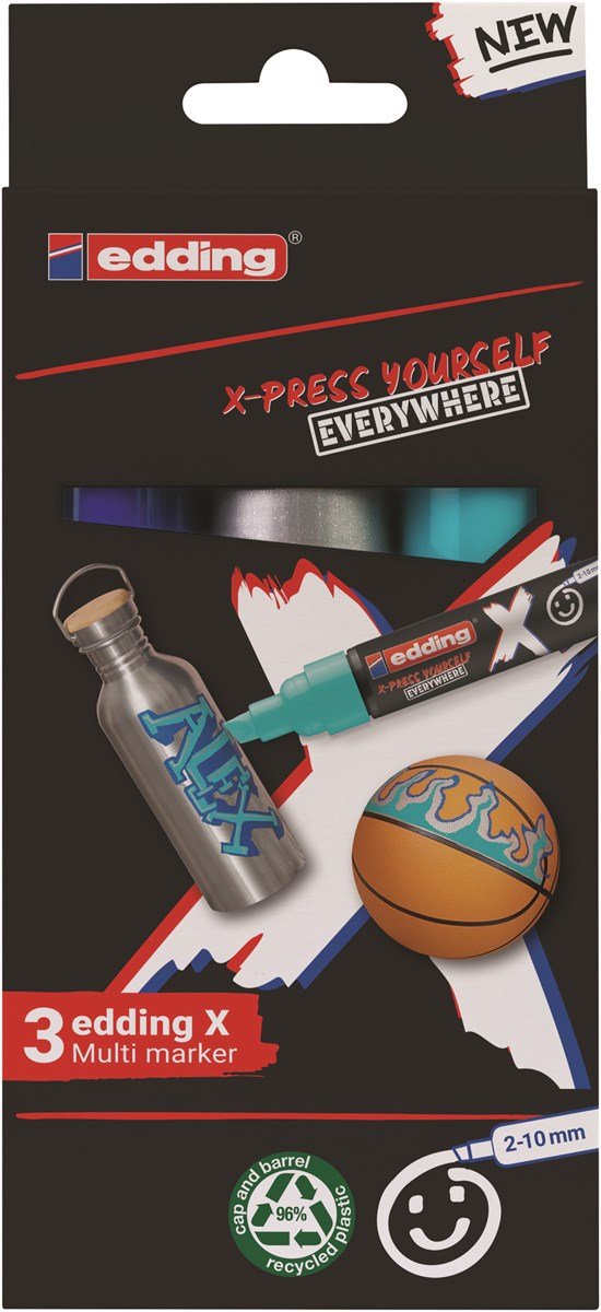 Edding 6900 X Multimarker. Colores de escritura: Azul, Plata, Turquesa, Tipo de punta: Punta de cincel, Material de la carcasa: Plástico reciclado. Tipo de embalaje: Caja. Cantidad por paquete: 3 pieza(s)