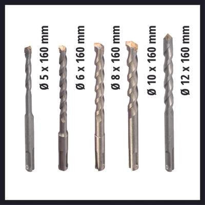 Einhell TE-HD 18 Li (1x2.5 Ah). Tipo de broca: SDS Plus, Color del producto: Negro, Rojo. Diámetro de perforación en hormigón (máx.): 1,2 cm, velocidad de ralentí (1 ª): 1100 RPM, Energía de impacto (máx): 1,2 J. Fuente de energía: Batería, Voltaje de la pila: 18 V, Tecnología de batería: Ión de litio. Peso: 1,85 kg, Ancho del paquete: 347 mm, Profundidad del paquete: 339 mm. Número de brocas: 5 pieza(s), Número de baterías incluidas: 1 pieza(s)