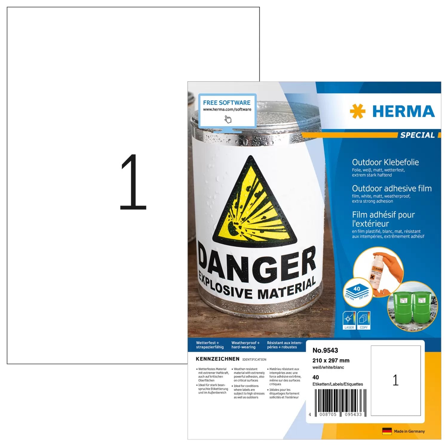 HERMA 9543. Color del producto: Blanco, Forma: Rectángulo, Formato: A4. Ancho: 210 mm, Altura: 297 mm. Etiquetas por paquete: 40 pieza(s). País de origen: Alemania