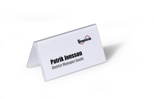 Ideal para conferencias, seminarios, recepciones y mostradores. Legibles por ambos lados. Diseño estable con forma de tejado. Con etiquetas en blanco intercambiables con marco decorativo.
