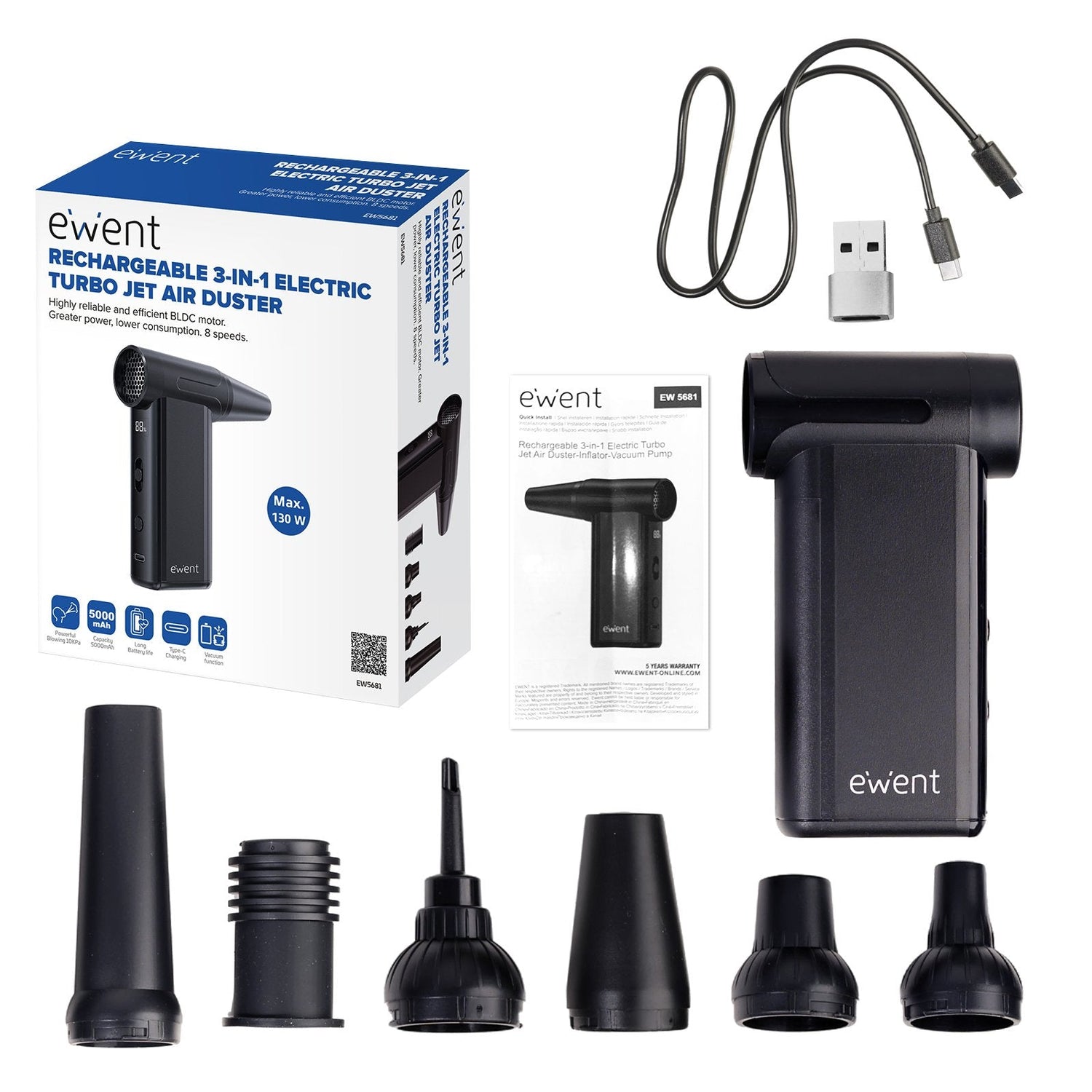 Ewent Pistola De Aire Comprimido 8 Velocidades, Aspirador, Bomba De Vacio E Inflador (130000 Rpm)