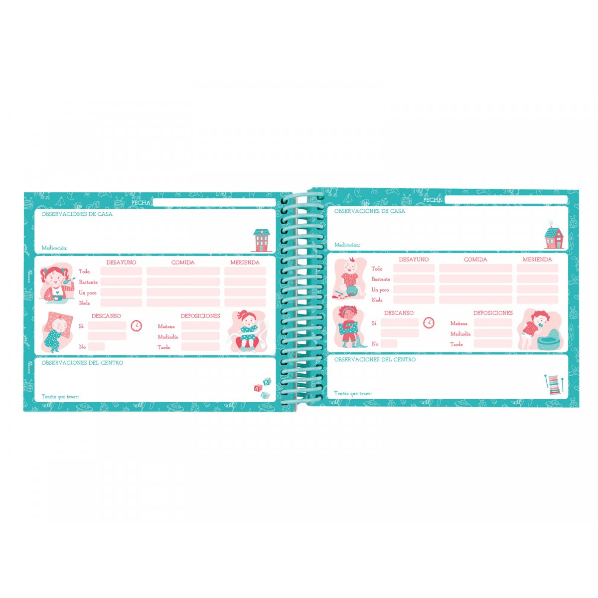 Agenda infantil de espiral de plástico para el control diario de los niños/as en etapa de educación infantil. Para escuelas infantiles y para párvulos. Las tapas de polipropileno permiten la personalización de la portada por parte de los padres o del centro educativo con la foto del niño/a. Cada página incorpora un campo libre para introducir la fecha. Con esquinas microperforadas para localizar rápidamente el día en curso. Espiral de plástico para evitar que el niño/a se haga daño. Goma elástica para evitar que se pierdan las hojas sueltas que se añadan o que se arruguen las páginas.