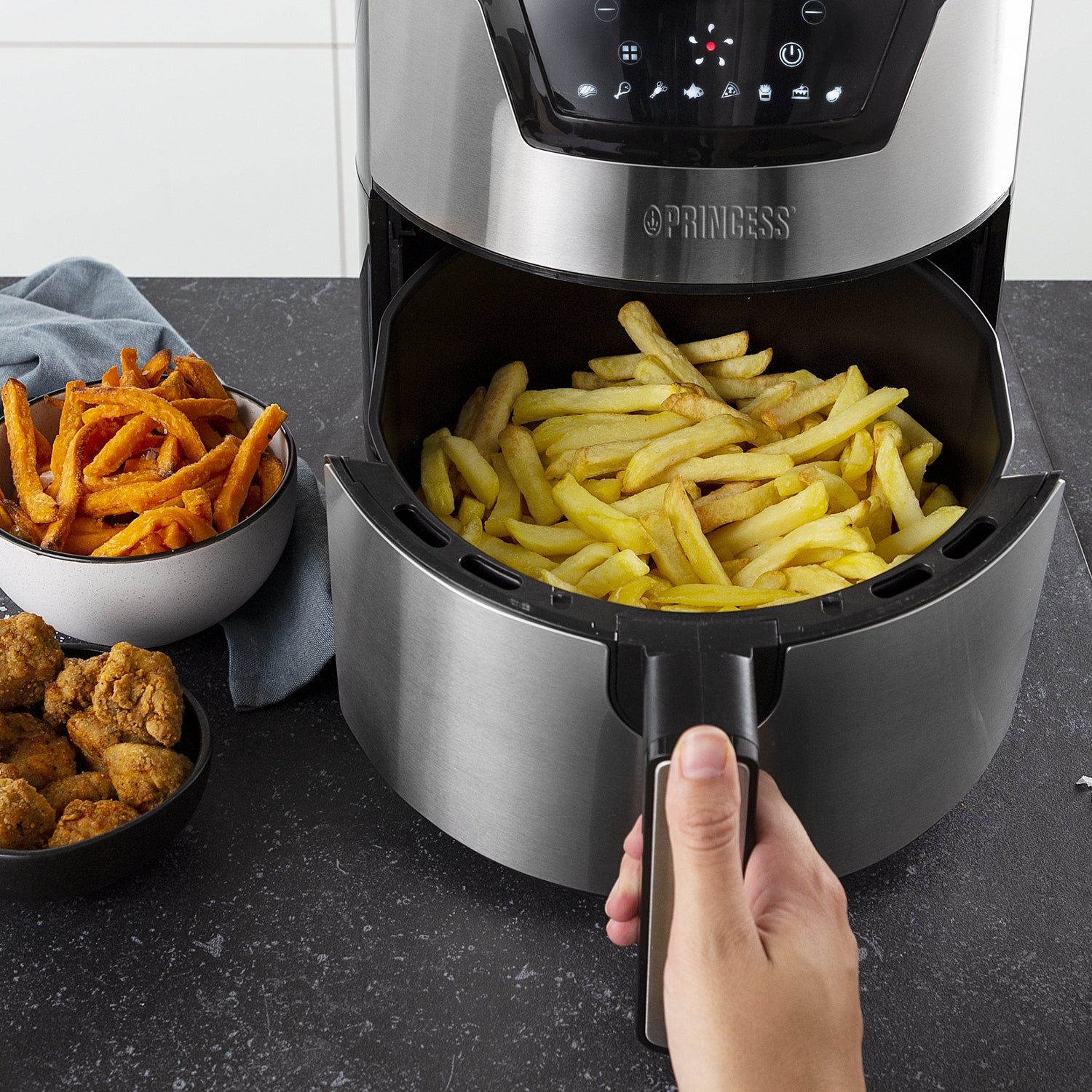 La freidora Princess Digital Aerofryer también puede asar, tostar y hornear sus platos favoritos. Si no conoce la temperatura perfecta y el tiempo de cocinado, la Princess Aerofryer cuenta con ocho ajustes preprogramados que puede iniciar con tan solo pulsar un botón para patatas fritas, carne, pescado, gambas, pollo, filetes y postres. Si prefiere usar sus propias configuraciones de temperatura y tiempo, puede utilizar el dial de control digital con temporizador integrado fácil de usar. De esta forma, podrá cocinar albóndigas, panecillos y quiches.