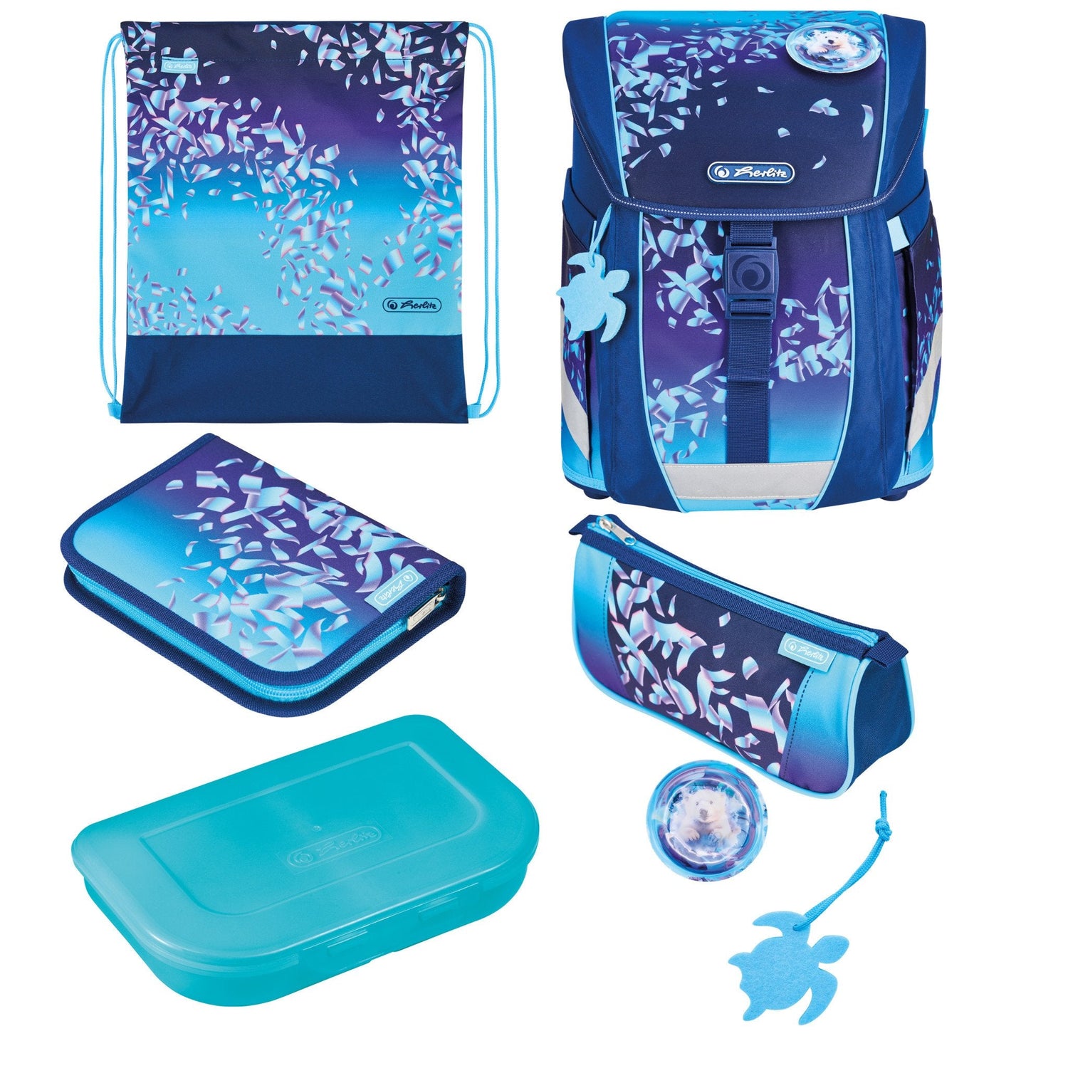 Herlitz FiloActive XL Plus Blue Ice. Juego de mochila escolar incluido: Caja para almuerzo, Estuche, Pencil pouch, Mochila escolar, Bolsa de deporte, Género recomendado: Chica, Edad escolar: Educación primaria. Ancho: 320 mm, Profundidad: 230 mm, Altura: 390 mm