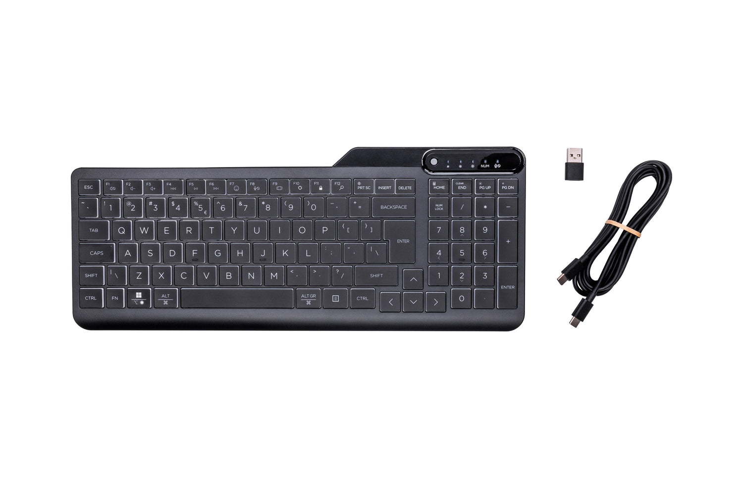 Este teclado portátil se conecta directamente a cualquiera de tus dispositivos. Equipado con un cable USB-C® y un adaptador USB-A, siempre está listo para empezar a trabajar. Práctico para ir a la oficina y viajar. Ilumina las teclas sin preocuparte por la duración de la batería. Un teclado siempre disponible donde y cuando necesites trabajar.