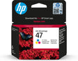 HP Cartucho de Tinta Original 47 tricolor. Tipo de tinta de color: Tinta a base de colorante, Tipo de cartucho de tinta: Rendimiento estándar, Tipo de suministro: Pack individual, Rendimiento de impresión de página con tinta de color: 700 páginas, Volumen de tinta de color: 14 ml, Colores de impresión: Cian, Magenta, Amarillo, Cantidad por paquete: 1 pieza(s)