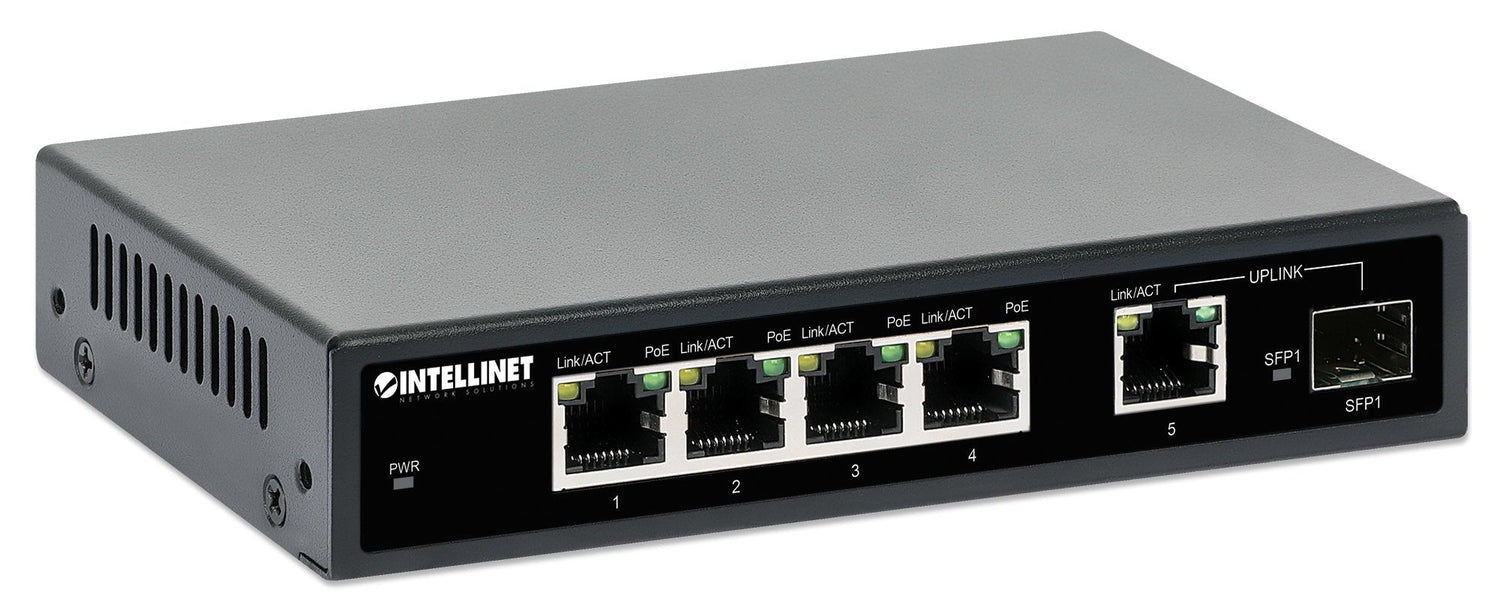 Intellinet 561822. Puertos tipo básico de conmutación RJ-45 Ethernet: Gigabit Ethernet (10/100/1000), Cantidad de puertos básicos de conmutación RJ-45 Ethernet: 5, Número de módulos SFP instalados: 1. Tabla de direcciones MAC: 2000 entradas, Capacidad de conmutación: 12 Gbit/s. Estándares de red: IEEE 802.3, IEEE 802.3ab, IEEE 802.3af, IEEE 802.3at, IEEE 802.3u, IEEE 802.3x. Energía sobre Ethernet (PoE). Montaje de pared