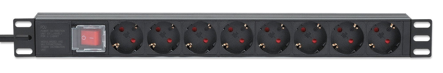 Intellinet 715126. Capacidad del rack: 1U, Tipo: Monofásico, Color del producto: Aluminio. Cantidad de salidas AC: 8 salidas AC, Tipo de salida AC: Tipo F, Conector: Tipo F. Longitud de cable: 2 m. Voltaje nominal de entrada: 220 - 250 V, Máxima corriente: 16 A, Frecuencia de entrada AC: 50 - 60 Hz. Certificación: CE RoHS REACH IEC 60297 IEC 60884