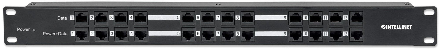 Intellinet Patch Panel de 12 puertos Passive PoE. Conector: RJ-45, Tipos de cable soportados: Cat5e. Color del producto: Negro, Material: Metal, Montaje: Montaje en bastidor. Ancho: 21,8 mm, Altura: 44,3 mm, Profundidad: 482,6 mm