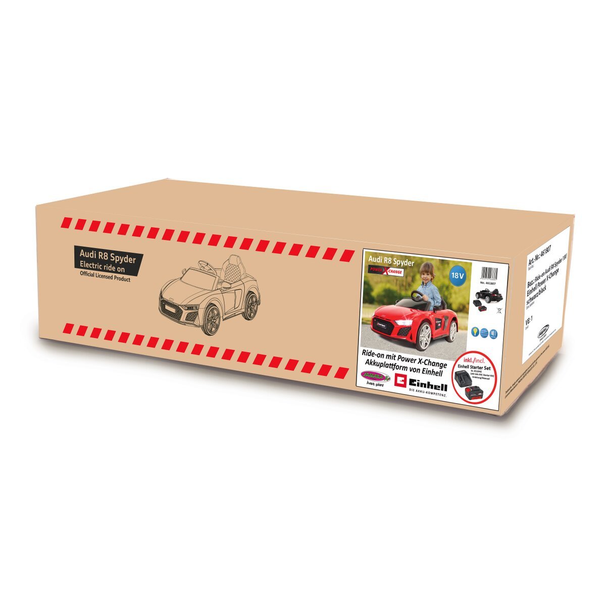El Audi R8 original es un coche deportivo producido en Alemania según el arte automovilístico alemán. Es bastante genial que esto se haya implementado para los conductores más pequeños en un vehículo eléctrico para niños. Este es el primer Ride-On con la plataforma de batería multifuncional de Einhell (¡Batería y cargador incluidos!). Con más de 100 herramientas y máquinas sin cable, Power X-Change de Einhell es ya uno de los sistemas de baterías más completos e innovadores del mercado. JAMARA ha aprovechado esta tecnología en colaboración con Einhell para alimentar los vehículos eléctricos para niños de JAMARA con la batería Power X-Change 18V. Con esta ampliación de la plataforma, JAMARA y Einhell siguen consecuentemente el camino de la sostenibilidad para evitar los residuos eléctricos. El pequeño Audi de JAMARA llama la atención por su detallado diseño y su gran parrilla del radiador. Con un volante multifunción con claxon y sonidos, un puerto USB, faros LED, puertas de accionamiento manual y muchos más puntos salientes, el Audi entusiasmará a los más pequeños cuando atraviese el pasillo hasta llegar al salón. Niños: subid, pulsad el botón de arranque, encended las luces y poned en marcha el potente motor y salid por el centro con el Ride-On-Car con licencia de JAMARA.