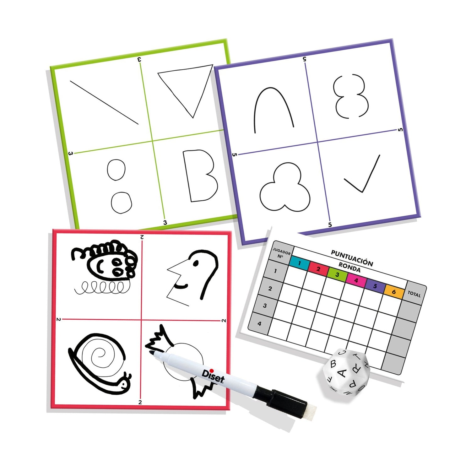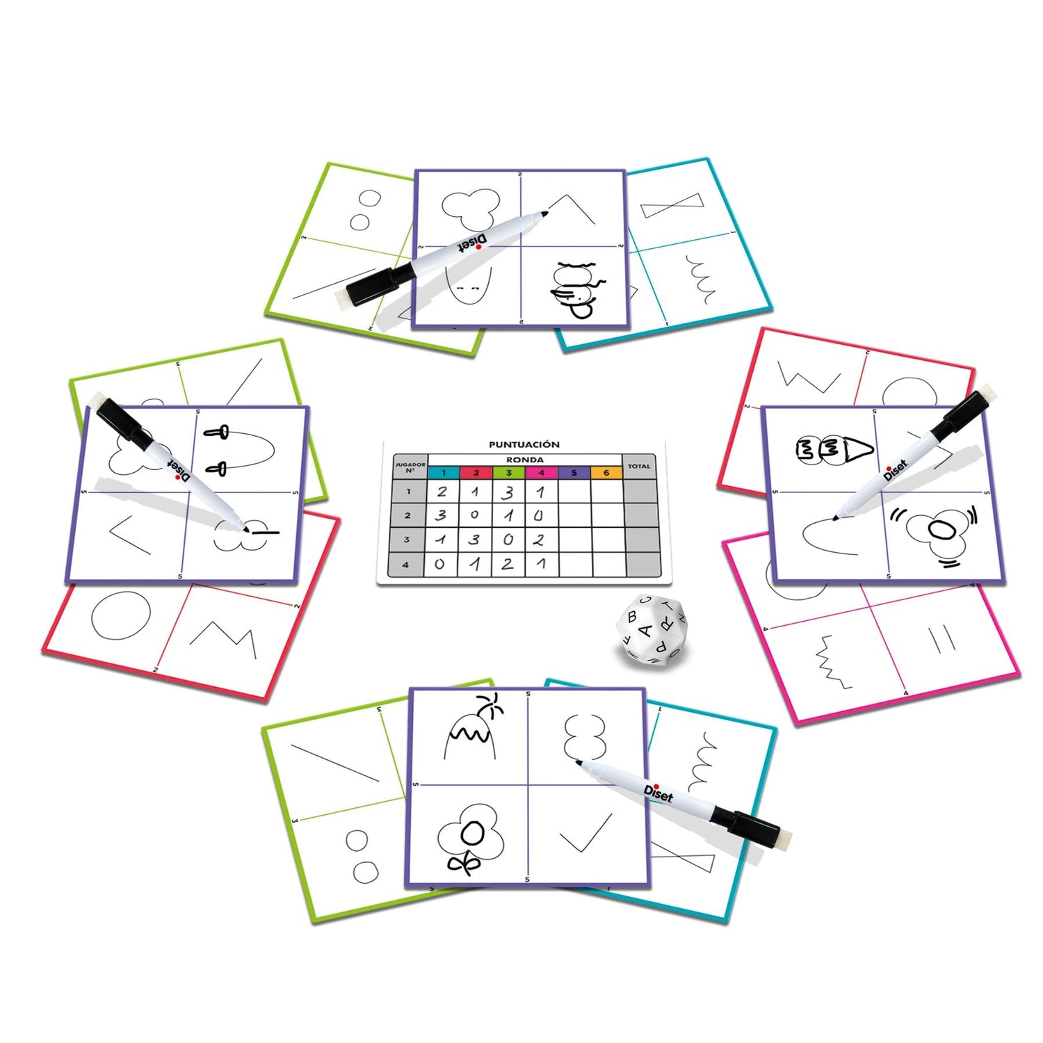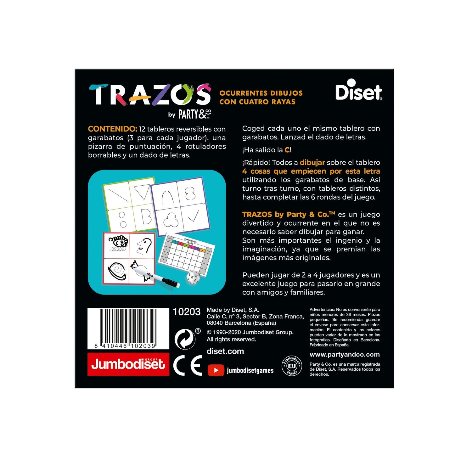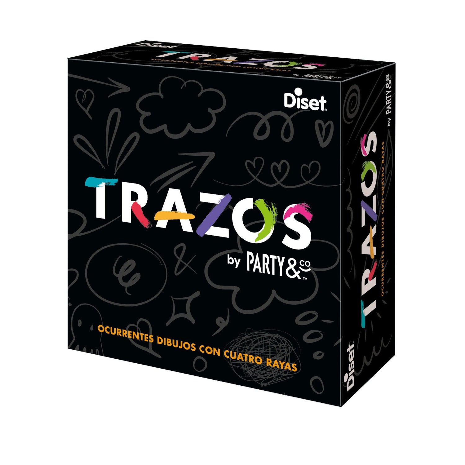 Party & co. Trazos es un juego inspirado en una de las pruebas del conocido juego de mesa party & co. Se trata de un divertido y ocurrente juego en el que no es necesario saber dibujar para ganar. El ingenio y la imaginación son la clave para ganar este juego. Todos los jugadores cogerán el mismo tablero con unos garabatos predeterminados. A continuación, se tira el dado de letras y todos los jugadores tendrán que dibujar sobre el tablero 4 cosas que empiecen por la letra que haya salido en el dado utilizando los garabatos predeterminados como base. Así se realizará turno tras turno, con los distintos tableros, hasta completar las 6 rondas del juego. ¡ganará el juego quien demuestre tener más ingenio e imaginación!