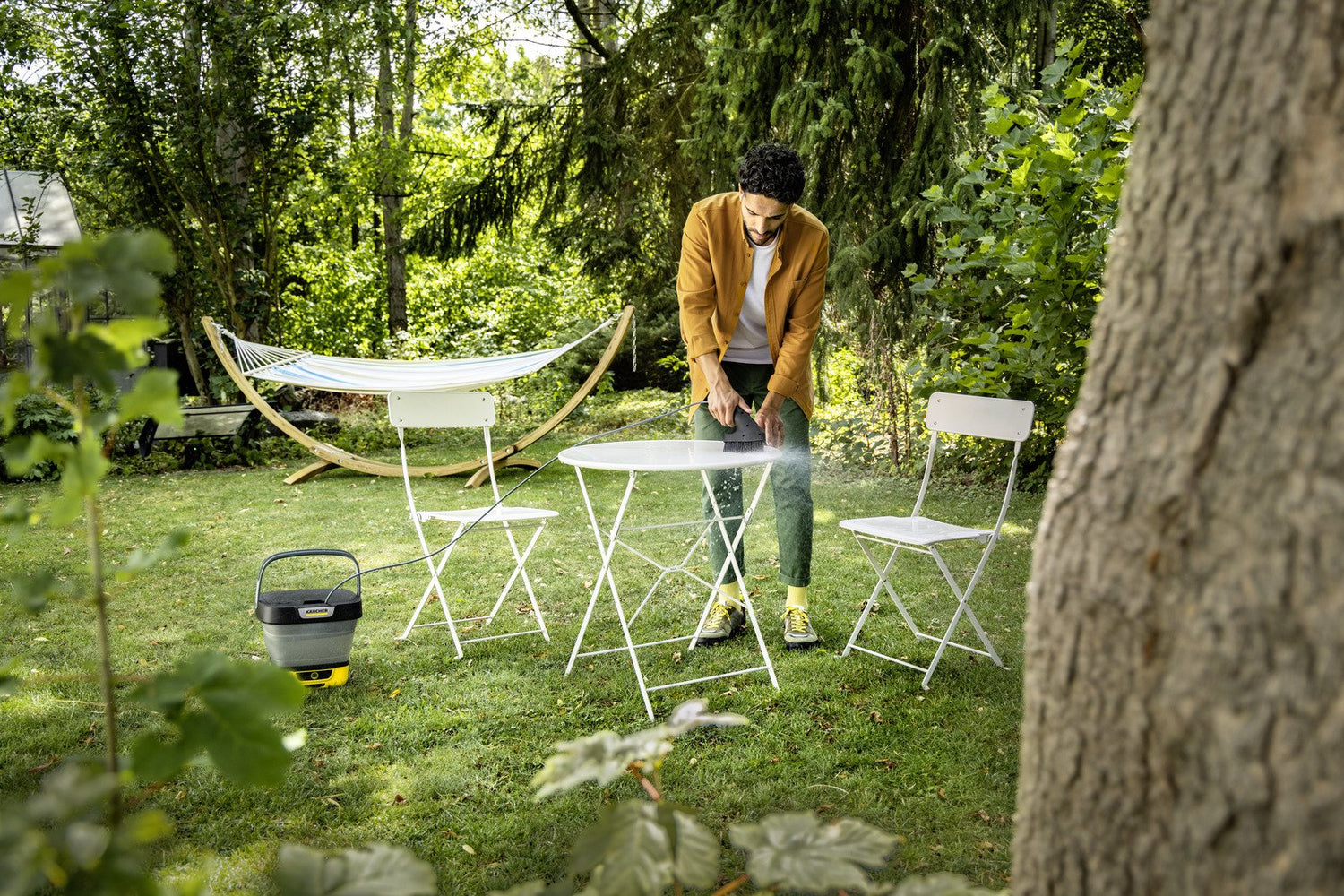 El cepillo para fregado es ideal para desprender y eliminar rápidamente la suciedad más resistente, como una película pegajosa de polen en los muebles de jardín o suciedad incrustada. Su combinación de chorro a presión y cerdas garantiza también un efecto de limpieza especialmente potente, incluso para una limpieza rápida. Los campos de aplicación pueden ser, por ejemplo, muebles de jardín, bicicletas y otro equipamiento de actividades al aire libre. El cepillo se monta directamente en la pistola. Con su perfil antideslizante y su forma ergonómica, el cepillo se adapta cómodamente a la mano para un trabajo seguro y sin fatiga. Puesto que el agua solo se utiliza cuando se acciona el gatillo del equipo, el consumo de agua se puede ajustar de forma muy eficiente y según las necesidades particulares. Esto sirve, a su vez, para cuidar la batería. El cepillo para fregado es compatible con todas las limpiadoras portátiles OC 3.