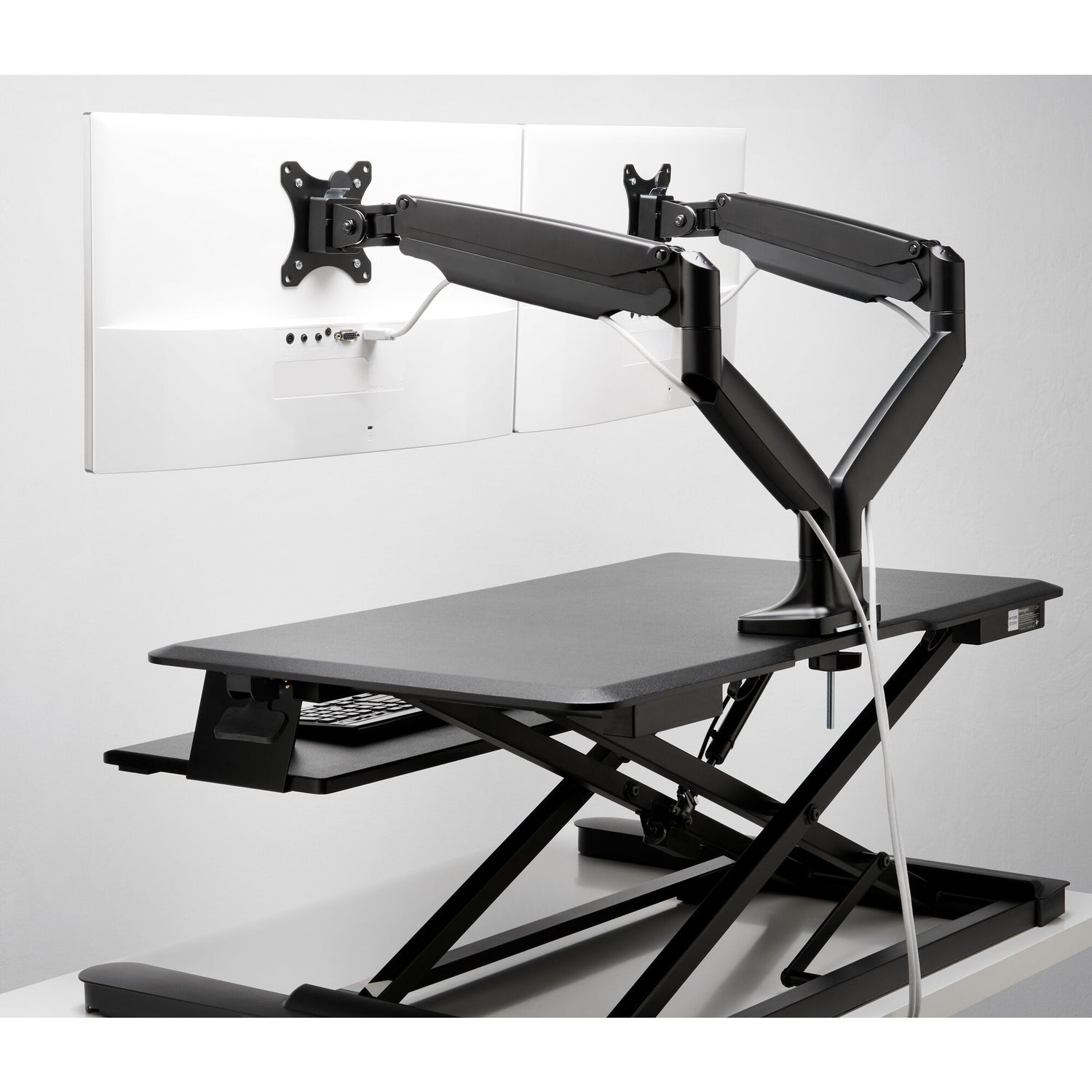 El sistema de gestión de cables del producto organiza y oculta los cables mientras los brazos elevan los dos monitores, lo que despeja un valioso espacio en el escritorio.
