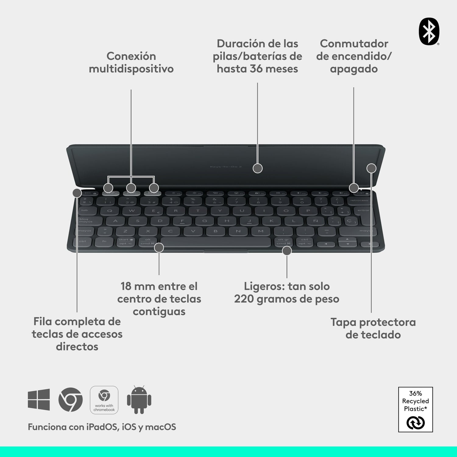 - Para cualquier pantalla y sistema operativo: usa el teclado inalámbrico Bluetooth Keys-to-Go 2 con tablets y dispositivos que utilizan Windows, Android, macOS y ChromeOS