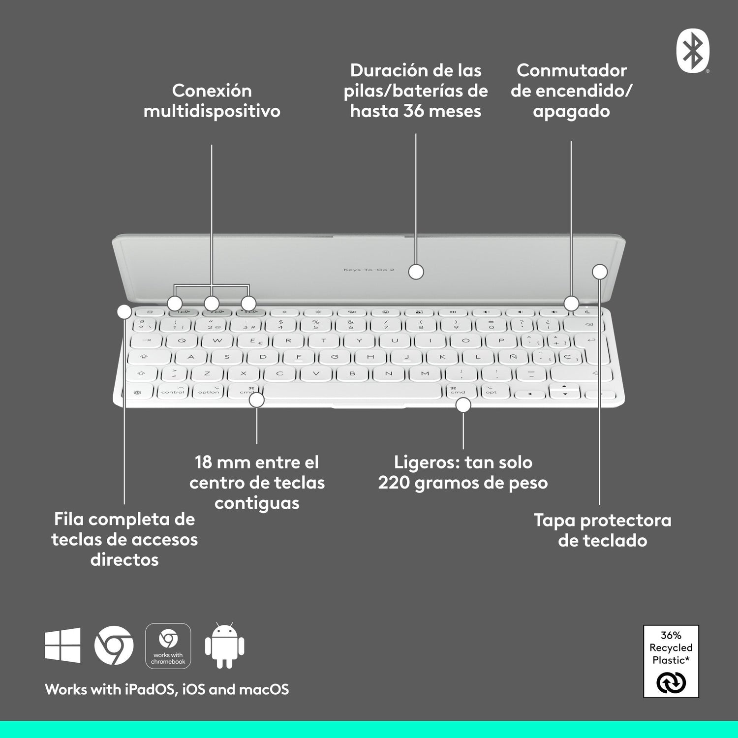 Logitech Keys-To-Go 2, Mini, Inalámbrico, Bluetooth, Switch de tecla de tijera, Gris, Blanco
