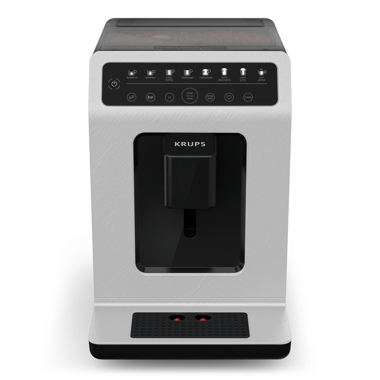 Krups Evidence ECO-Design EA897A. Tipo de producto: Máquina espresso, Máquina de café: Totalmente automática, Capacidad de reservorio de agua: 2,3 L, Café tipo de entrada: Granos de café, Depósito para café preparado: Taza, Capacidad en tazas: 2 tazas, Número de surtidores: 2, Molinillo integrado. Potencia: 1450 W. Color del producto: Negro, Gris