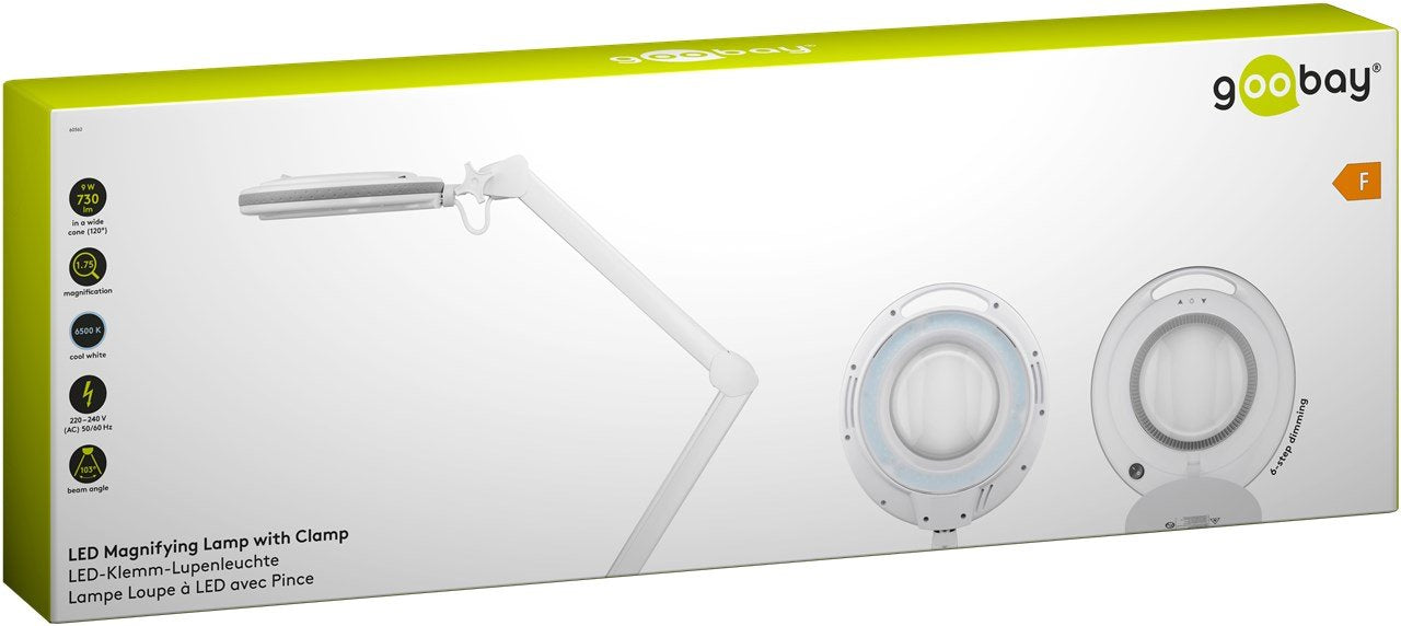 Goobay 60362. Ampliación: 1,75x, Material de la lente: Vidrio, Diámetro de lente: 12,7 cm. Fuente de energía: Corriente alterna, Voltaje de operación: 230 V, Consumo energético: 9 W. Material de la carcasa: Metal, Plástico, Color del producto: Blanco. Ancho: 650 mm, Profundidad: 230 mm, Altura: 820 mm. Cantidad por paquete: 1 pieza(s), Tipo de embalaje: Caja