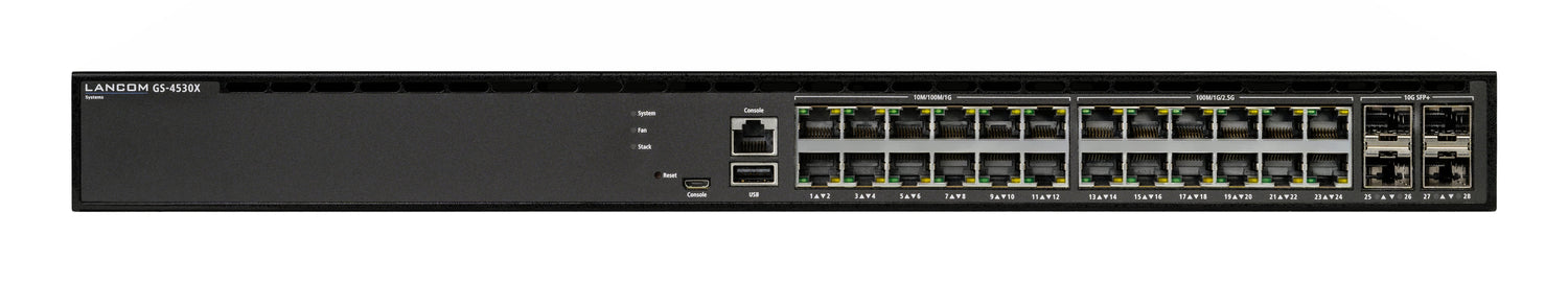 LANCOM GS-4530X. Tipo de interruptor: Gestionado, Capa del interruptor: L3. Puertos tipo básico de conmutación RJ-45 Ethernet: 2.5G Ethernet (100/1000/2500), Cantidad de puertos básicos de conmutación RJ-45 Ethernet: 30, Cantidad de puertos USB 2.0: 1, Puerto de consola: RJ-45/Micro-USB. Tabla de direcciones MAC: 32000 entradas. Estándares de red: IEEE 802.1D, IEEE 802.1Q, IEEE 802.1Qav, IEEE 802.1Qbb, IEEE 802.1ab, IEEE 802.1ad, IEEE 802.1ak,.... Montaje en rack, Factor de forma: 1U