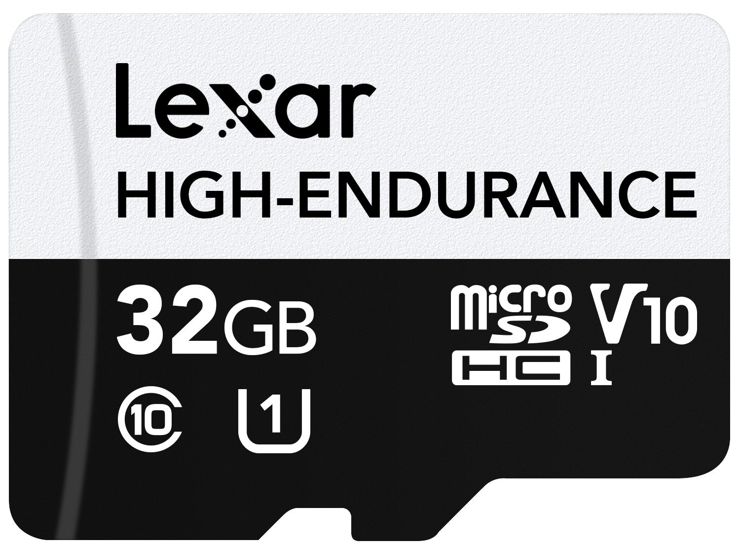 Lexar High-Endurance. Capacidad: 32 GB, Tipo de tarjeta flash: MicroSDHC, Clase de memoria flash: Clase 10, Tipo de memoria interna: UHS-I, Clase de velocidad UHS: Class 1 (U1), Clase de velocidad de vídeo: V10