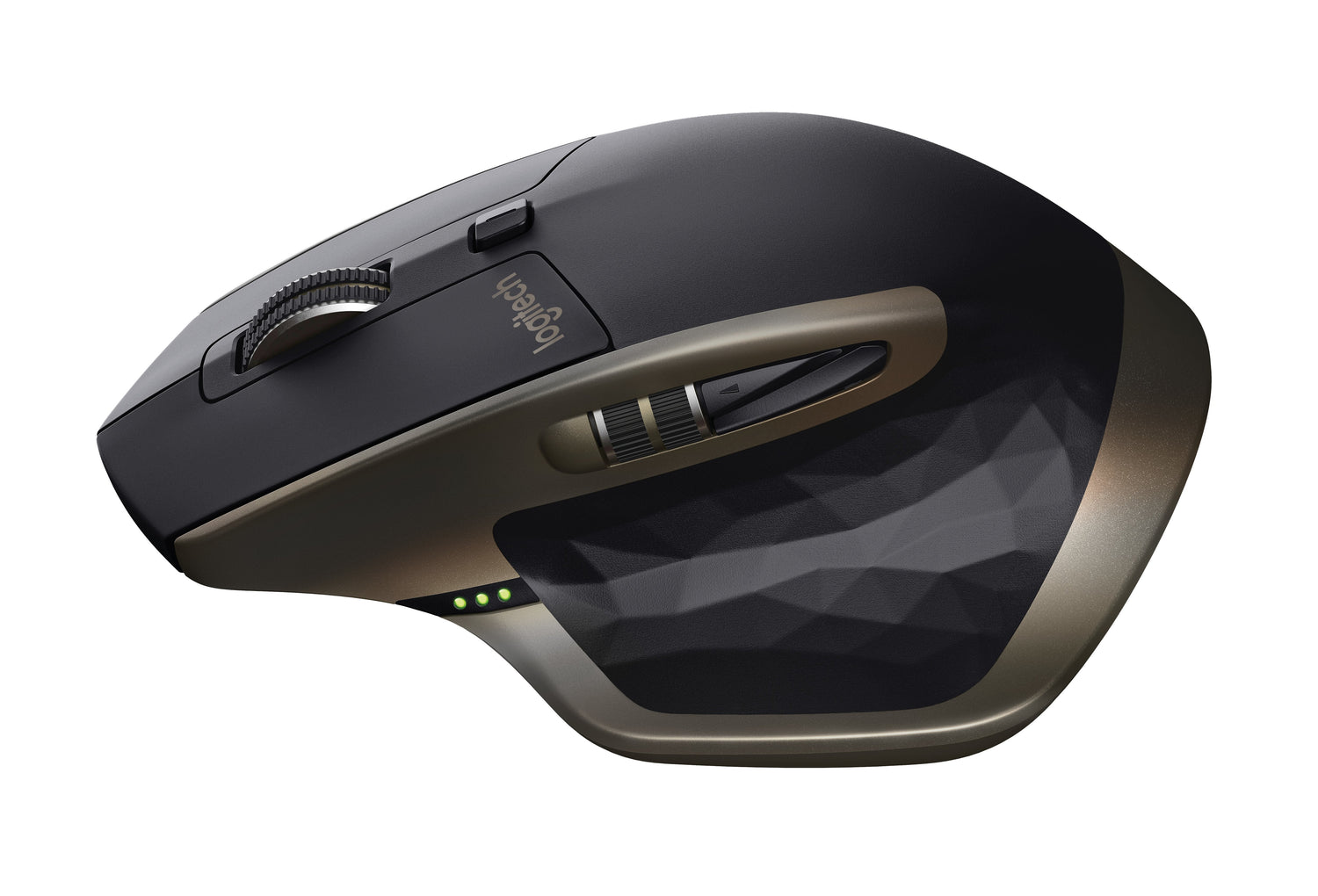Logitech MX Master Wireless Mouse. Factor de forma: mano derecha. Tecnología de detección de movimientos: Laser, Interfaz del dispositivo: RF Wireless + Bluetooth, Resolución de movimiento: 1000 DPI, Tipo de botones: Botones presionados, Cantidad de botones: 7, Tipo de desplazamiento: Rueda. Fuente de energía: Baterías. Color del producto: Negro, Bronce