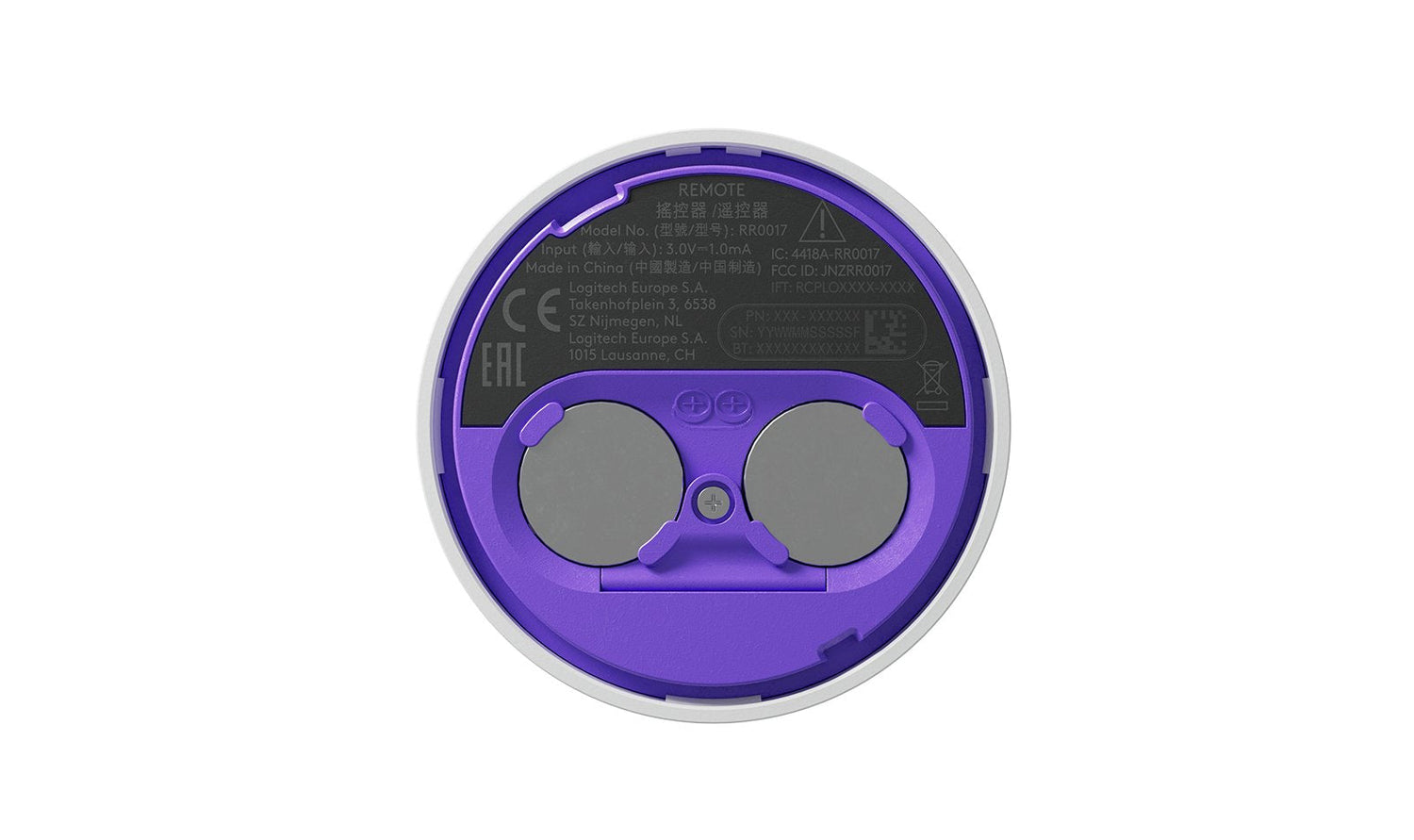 Logitech 952-000102. Tipo de producto: Mando a distancia, Color del producto: Blanco, Marca compatible: Logitech. Alimentación: Batería, Tipo de batería: CR2032, Tecnología de batería: Litio. Ancho: 71,8 mm, Profundidad: 71,8 mm, Altura: 12,7 mm. Peso del envase completo: 2,26 kg, Longitud de la caja: 256 mm, Ancho de la caja principal: 219 mm. Capacidad de batería: 0,675 Wh