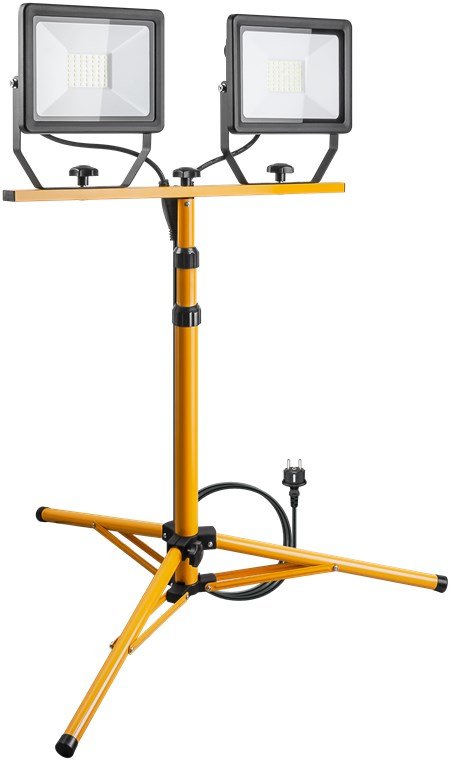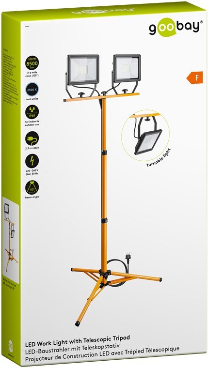 Goobay 49984. Tipo: Luz de trabajo independiente, Color del producto: Negro, Amarillo, Longitud del cable: 2,5 m. Tecnología de la bombilla: LED, Potencia total: 100 W, Flujo luminoso: 8500 lm. Fuente de energía: Corriente alterna, Clase de eficiencia de energía: F, Consumo de energía por 1000 horas: 100 kWh. Ancho: 880 mm, Profundidad: 880 mm, Altura (min.): 87 cm