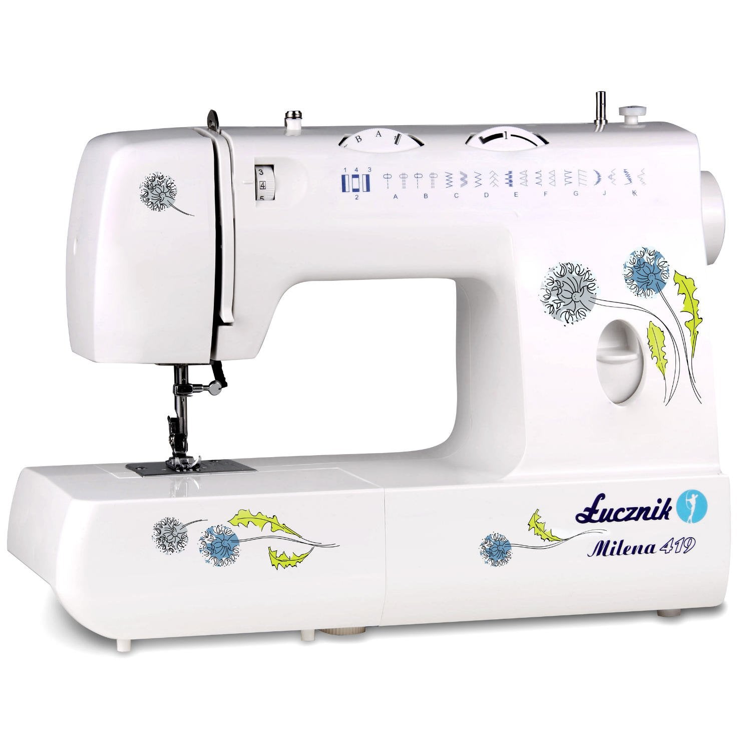 Łucznik Milena II 419. Color del producto: Blanco, Tipo: Máquina de coser manual, Funciones de la máquina de coser: Costura. Tipo de fuente de alimentación: Eléctrico, Potencia: 70 W, Voltaje de entrada AC: 230 V. Ancho: 165 mm, Profundidad: 410 mm, Altura: 325 mm. Peso del paquete: 7,3 kg. Número de bobinas: 3 pieza(s)
