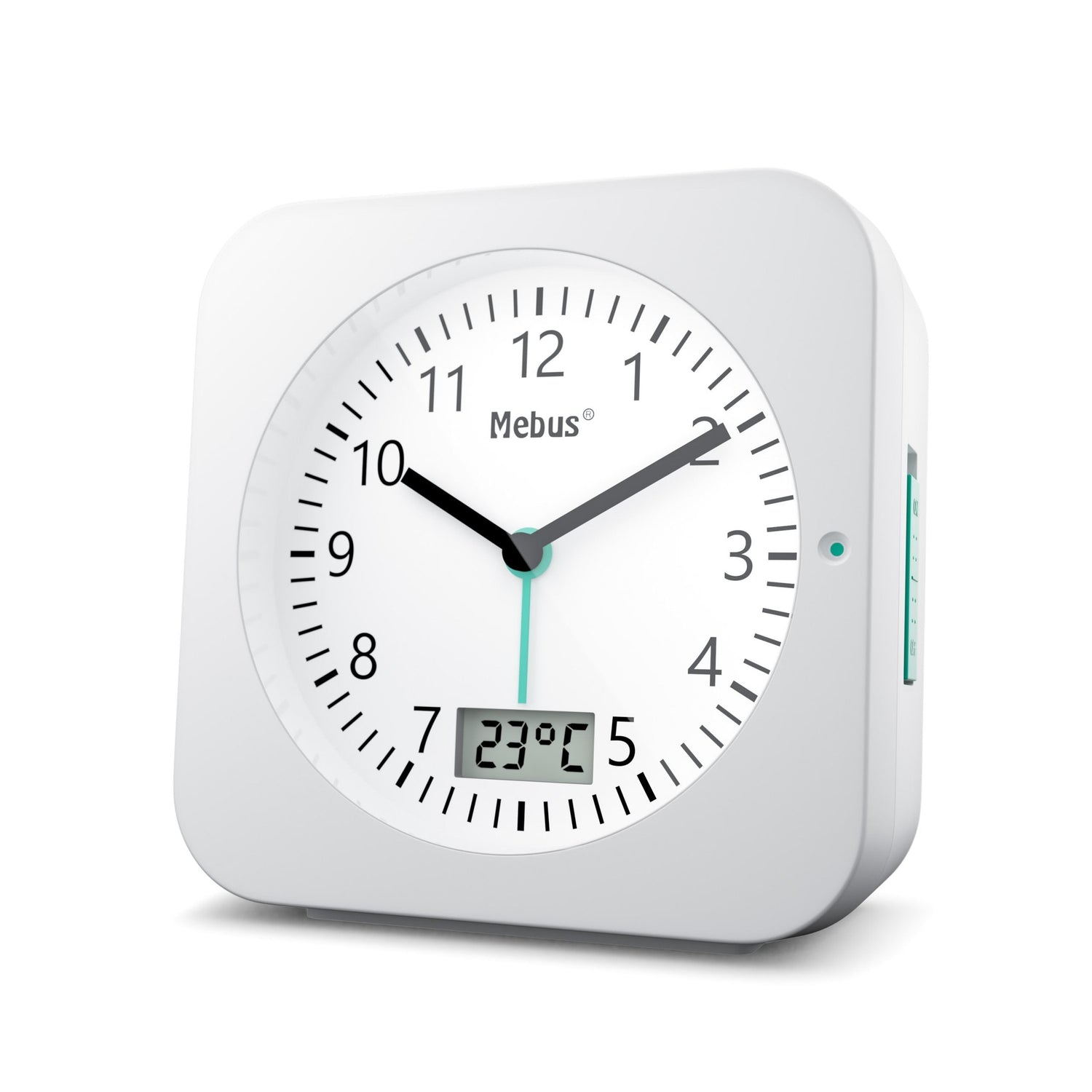 Mebus 25610. Tipo: Reloj despertador digital, Color del producto: Blanco, Formato de hora: 12h. Tipo de visualizador: Analógica. Fuente de energía: Batería, Tipo de batería: AA, Voltaje de la pila: 1,5 V. Ancho: 94 mm, Altura: 93 mm, Profundidad: 30 mm. Cantidad por paquete: 1 pieza(s)