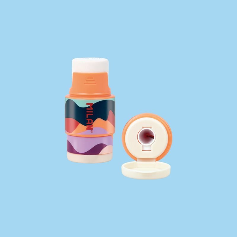 Combinación de goma de borrar y sacapuntas con depósito. Diseño EXTENSION, serie The Fun. Goma suave de caucho sintético flexible. El sacapuntas dispone de una cuchilla de acero afilada y resistente, ideal para todo tipo de lápices. Sacapuntas con cuchilla de seguridad: este sistema evita que se pueda separar la hoja del cuerpo del sacapuntas. Depósito extensible. Diseño original creado por el departamento de I+D de MILAN. Tres combinaciones de colores distintas: naranja, violeta y azul. Gomas de recambio disponibles.