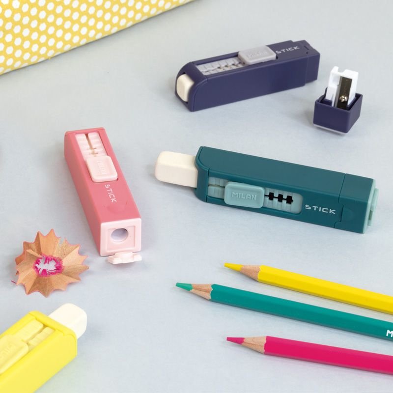 Combinación de goma de borrar y sacapuntas con depósito. Diseño STICK. Goma rectangular de gran longitud. El sacapuntas dispone de una cuchilla de acero afilada y resistente, ideal para todo tipo de lápices. Sacapuntas con cuchilla de seguridad: este sistema evita que se pueda separar la hoja del cuerpo del sacapuntas. 4 colores surtidos: amarillo, lila, rosa y verde. Diseño original creado por el departamento de I+D de MILAN. Gomas de borrar de recambio disponibles.