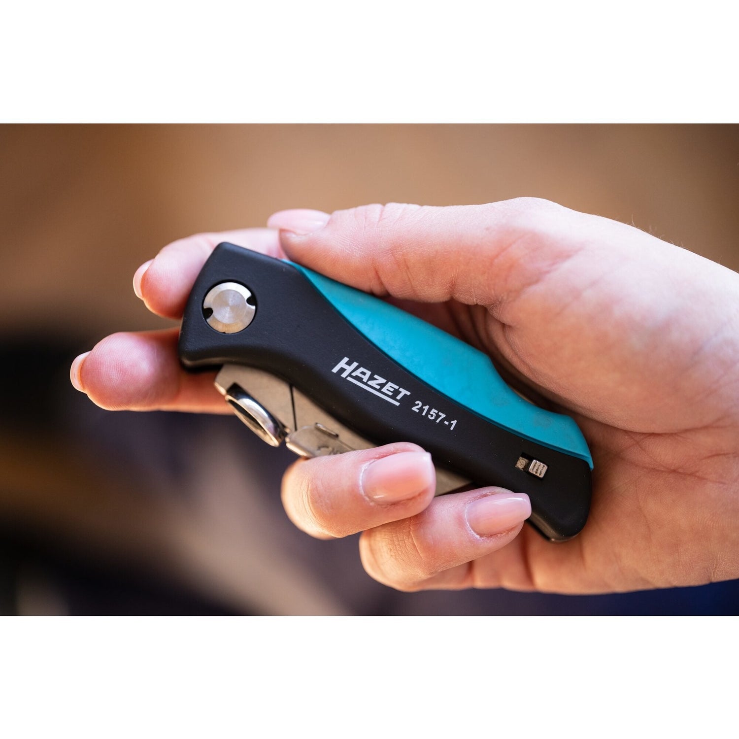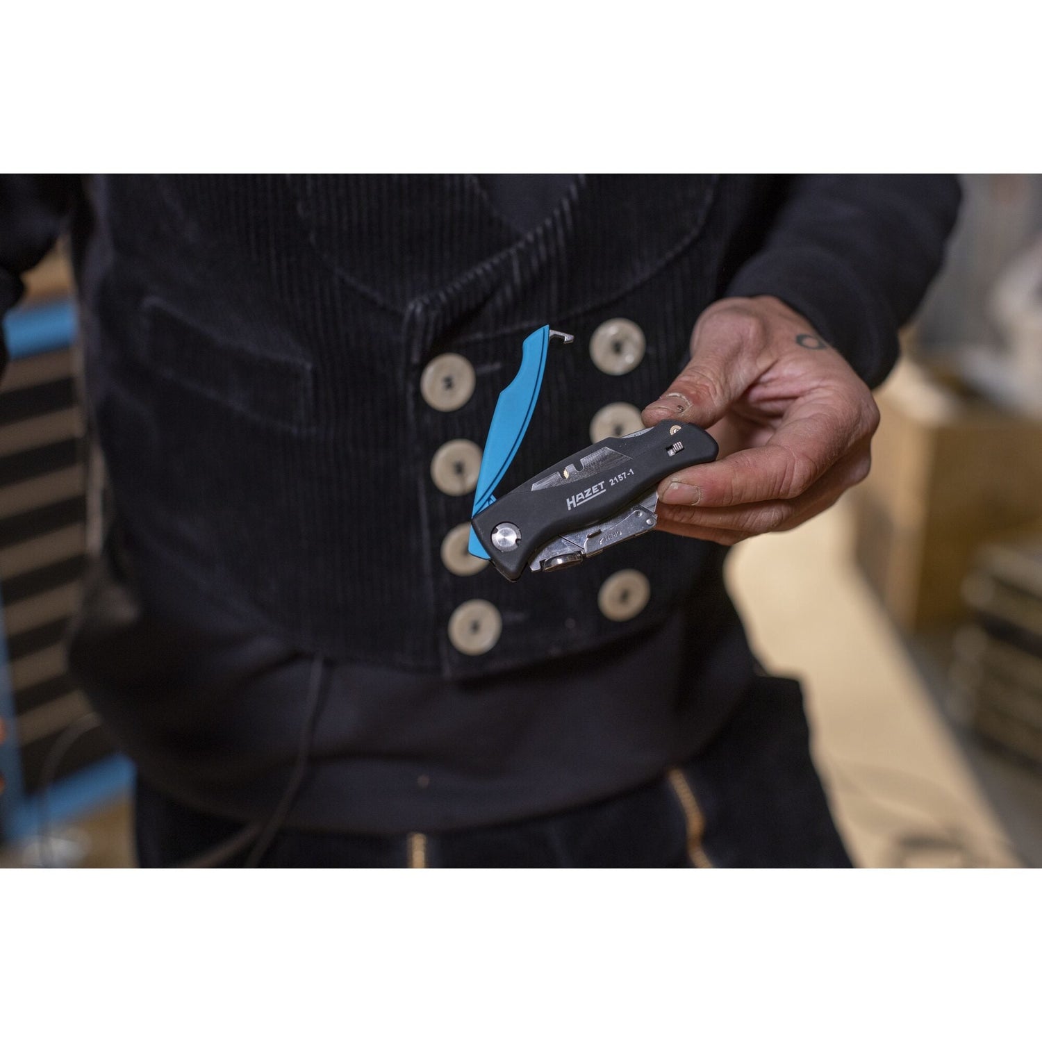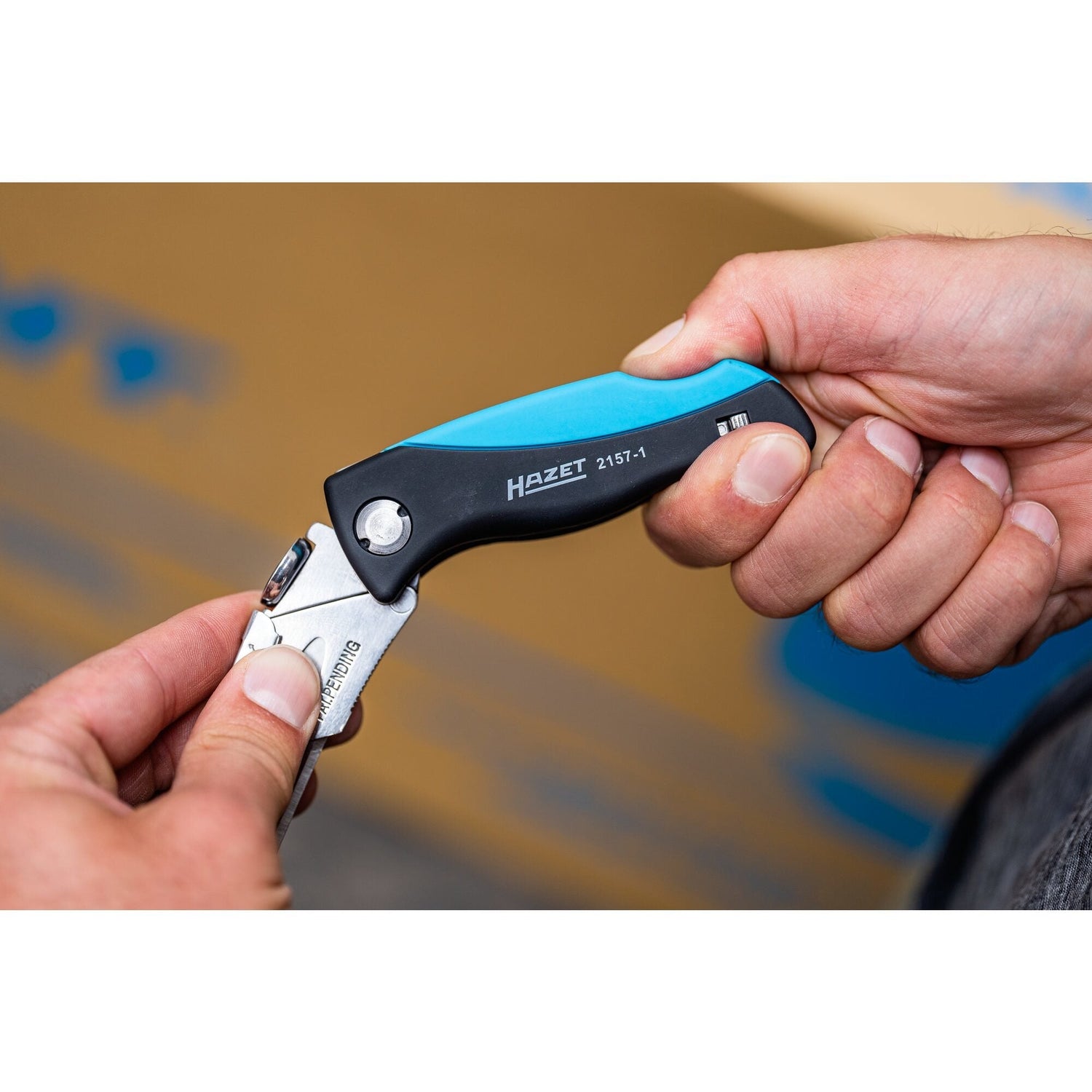 HAZET 2157-1. Tipo de construcción: Navaja con hoja bloqueable, Material de agarradera: ABS sintéticos, Color del producto: Negro, Azul. Longitud total: 16 cm, Peso: 170 g