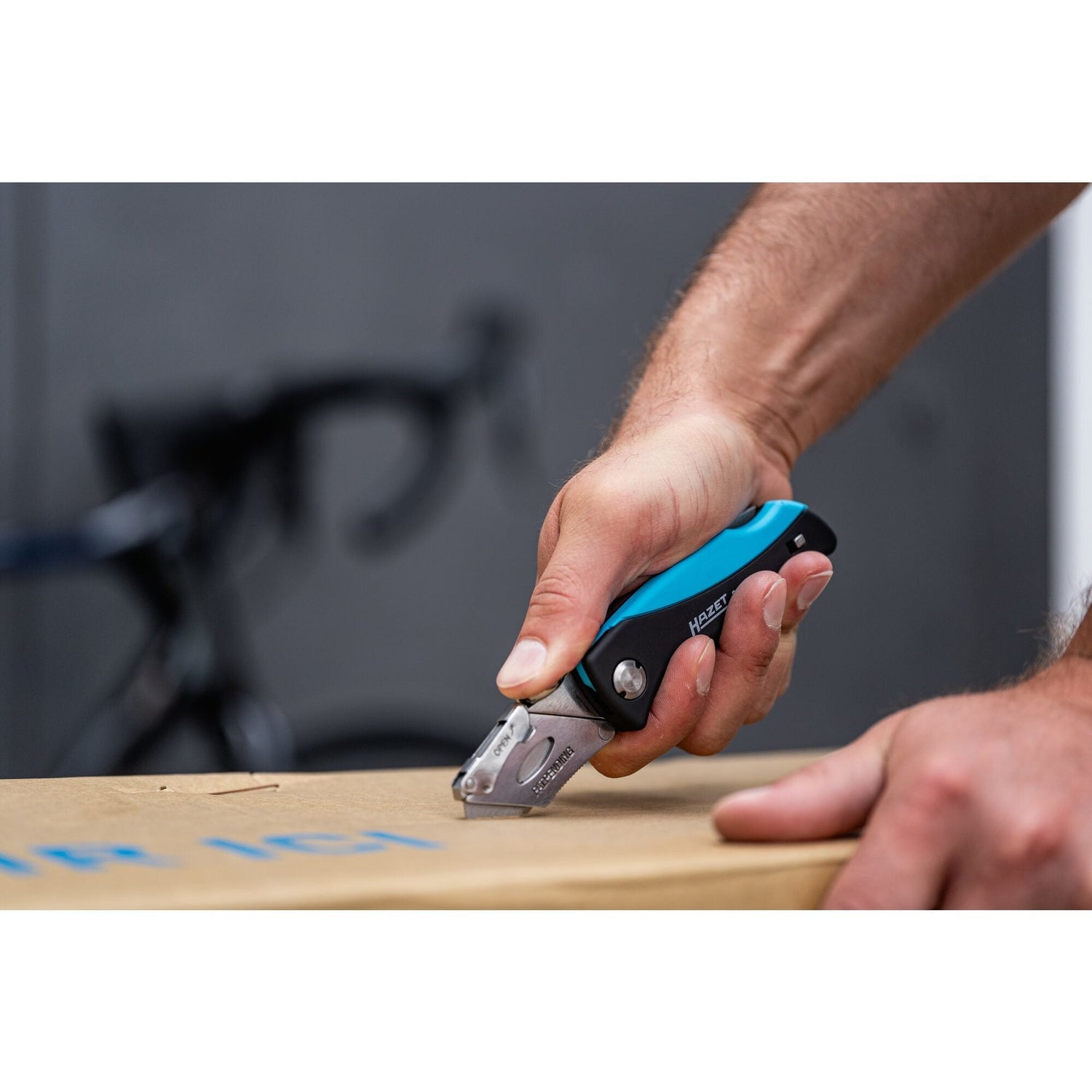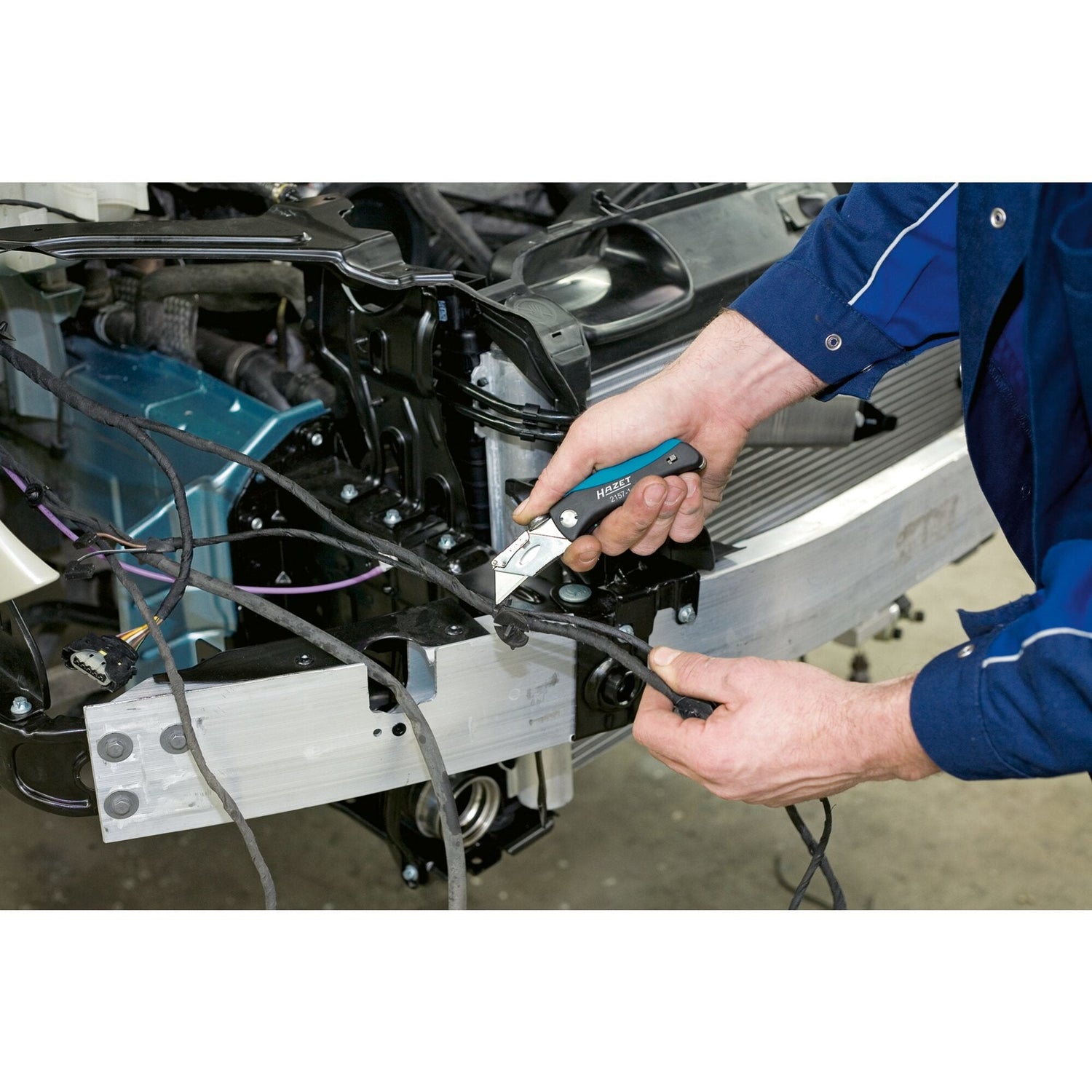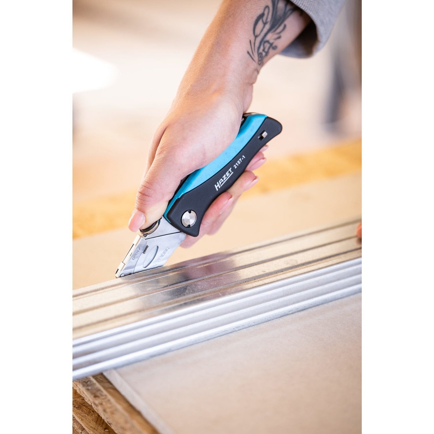 HAZET 2157-1. Tipo de construcción: Navaja con hoja bloqueable, Material de agarradera: ABS sintéticos, Color del producto: Negro, Azul. Longitud total: 16 cm, Peso: 170 g